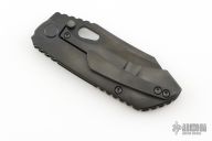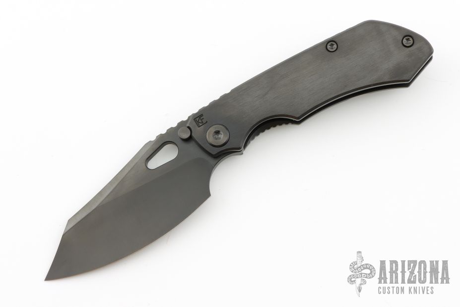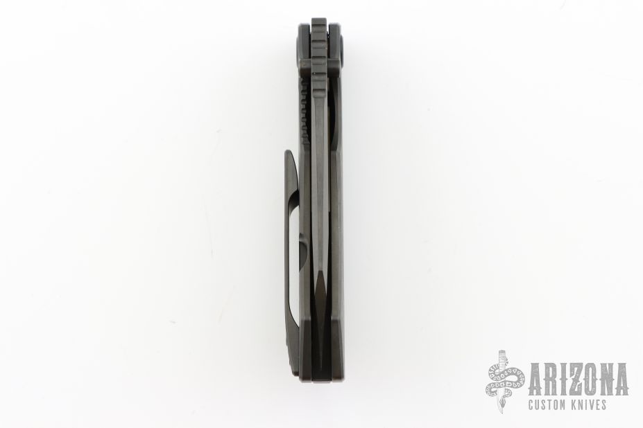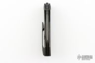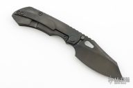 This knife by Custom Knife Factory features a black blade with notched thumbrest and thumbhole. The handle has a black bark finished titanium frame with a matching tip up clip and backspacer. Comes with CKF velcro case, extra hardware, and COA. Nice detent, lockup and blade seating. #282 and dated Jan 24. Has a couple light scuffs, otherwise Excellent Condition.