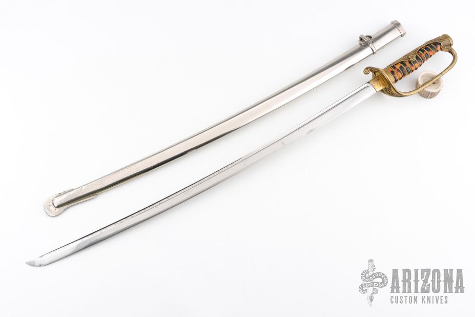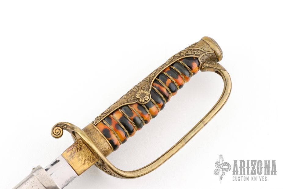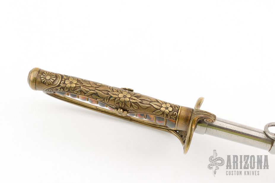 It has a nicely polished blade with bohi/fullers, .251" blade stock and 1.013" blade depth, hidden tang construction. The handle has a decorated brass habaki, fileworked brass seppa, pierced and engraved brass D-guard, stippled and engraved brass handle fittings, black/orange fluted grip with twisted brass wire inlays. Comes with the matching plated steel scabbard. The scabbard has some light scratches and minor pitting, and a dent near the tip. The sword has some light scratches and patina on the blade, overall excellent condition for its age.