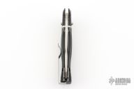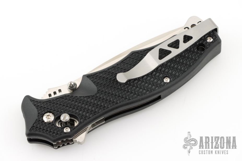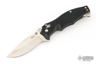 This Vulcan from SOG features a drop point recurve satin finished blade with swedge,  dual thumbstuds, notched thumbrest and flipper. The handle has black molded black composite, stainless steel liners, and a black composite backspacer. Includes original box and papers. Excellent condition.