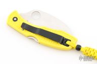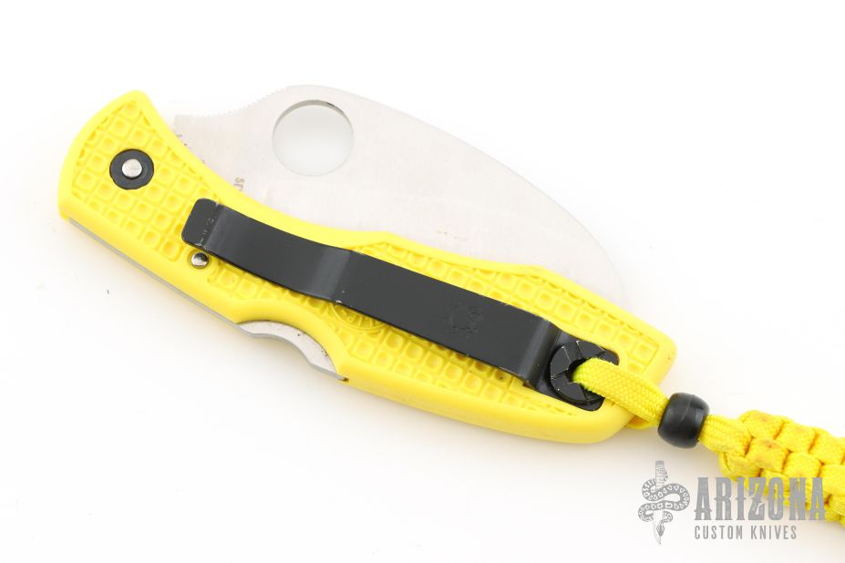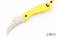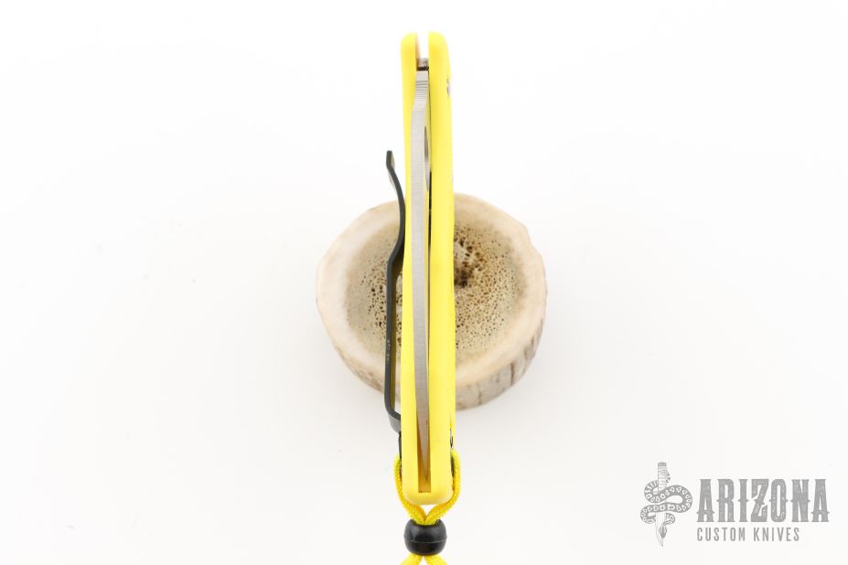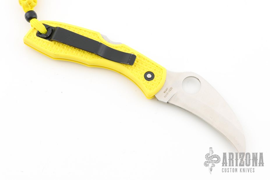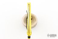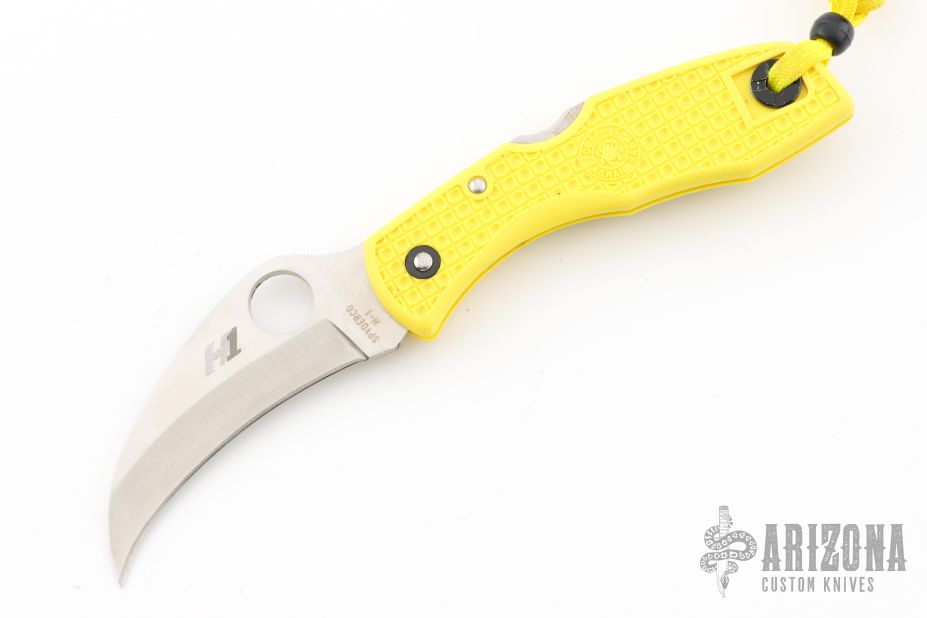 This knife features a satin finished hawkbill blade with thumbhole and notched thumbrest. The handle has yellow FRN scales, and a tip up black SS reversible clip. Comes with original box. Excellent condition. Blade Steel: H-1