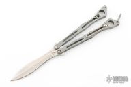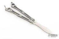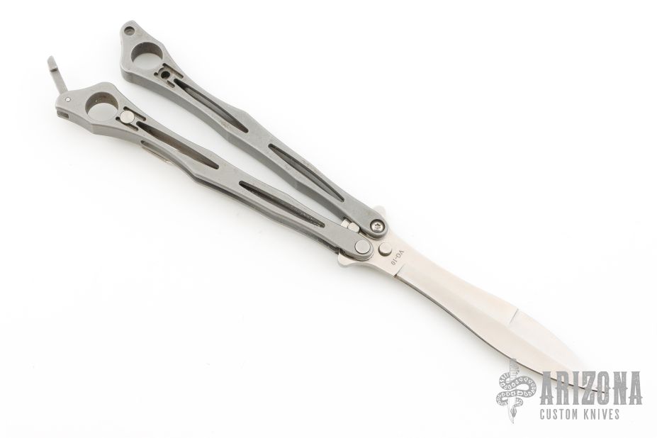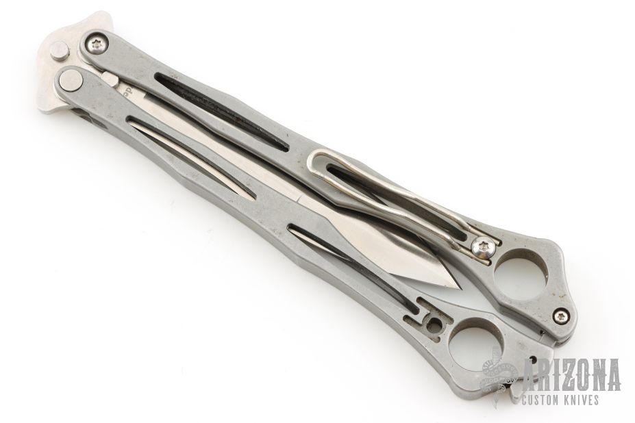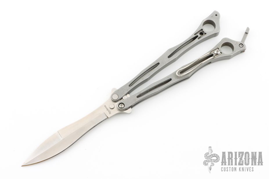This Spyderfly Balisong by Spyderco features a satin finished spear point VG-10 blade with a false top edge. The handles are bead blasted stainless steel with a tip up clip (4-way reversible). Has scratches and scuffs on the handle, otherwise good condition. Comes with original box.