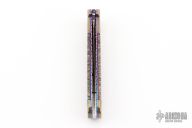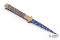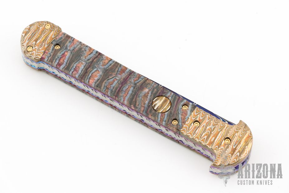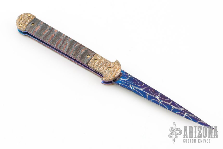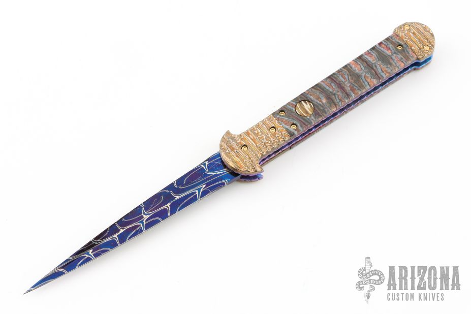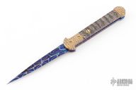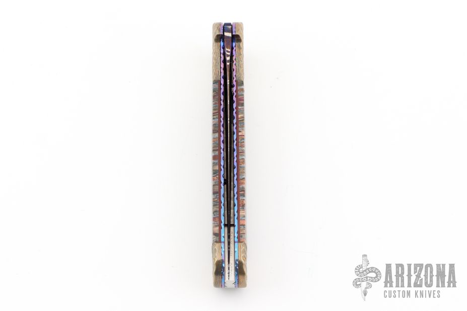 This C-Lance automatic by Rainy Vallotton features a Damascus blade with a false top edge edge.  The handle has Vegas Forge Mokume bolsters and push button with mammoth molar scales.  Anodized and fileworked titanium liners.  Steel backspacer.  Excellent Condition.
