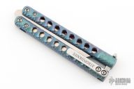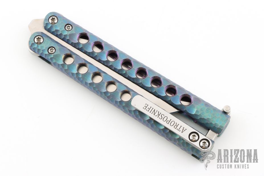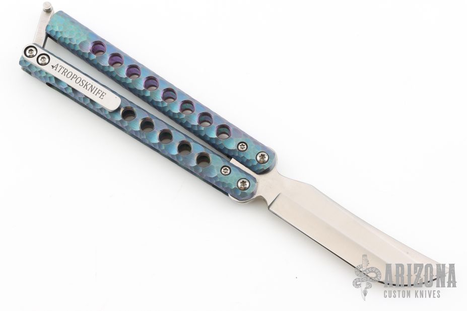 This Demon by Atropos features a satin finished blade. The handles are channel construction carved/anodized finished titanium with a matching T-latch. Comes with zippered case. Excellent condition.
