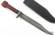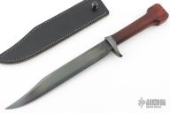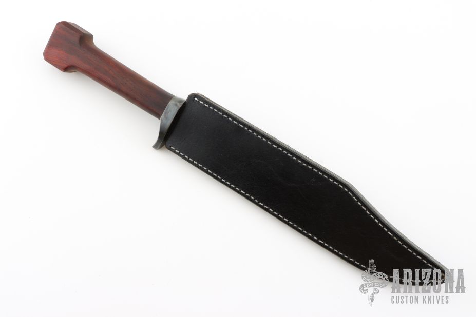 This Custom Dog Bone Bowie by Muskrat Man features a clip point full flat ground blade with sharpened top edge, blued finish, .169" blade stock and 1.379" blade depth, hidden tang construction. The handle has a soldered mild steel guard with a blued finish, cocobolo dogbone style handle. Tang is nearly the full length of the handle. Balances just forward of the guard, very light and fast for it's size. Comes with a black leather sheath. Excellent condition.