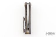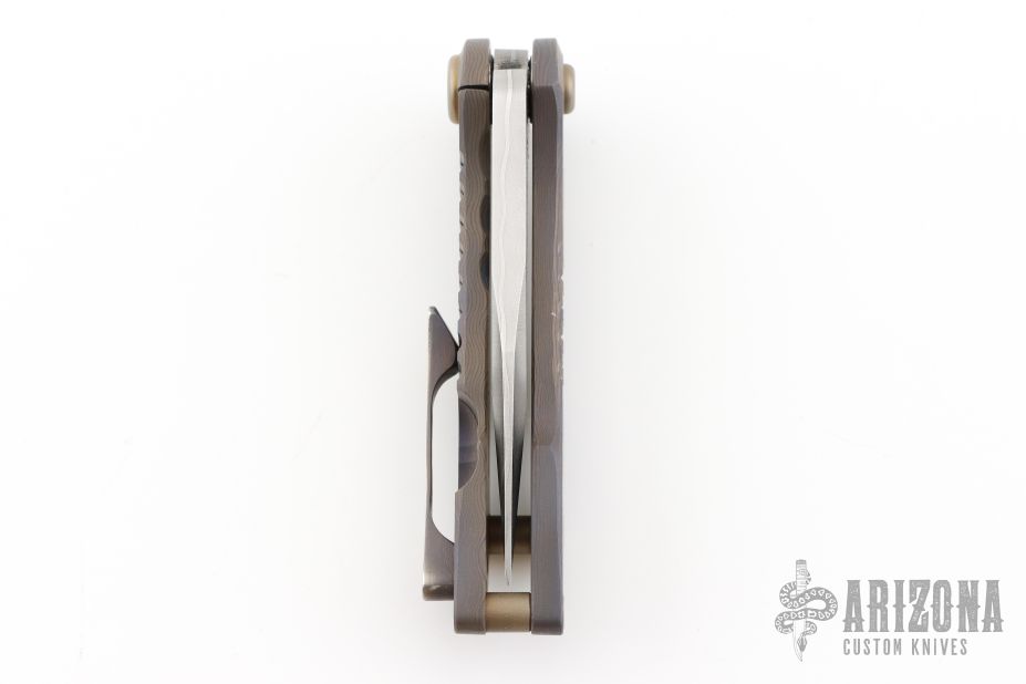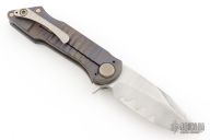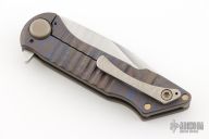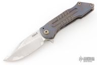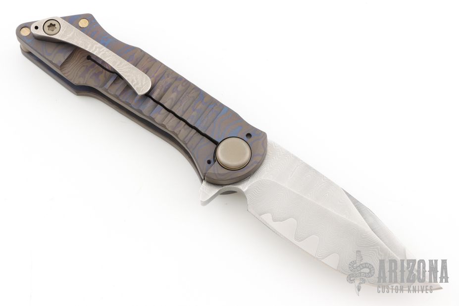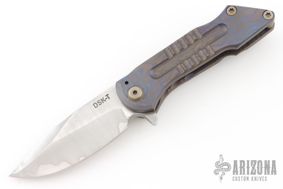 This flipper from DSK Tactical Knives features a San Mai Damascus tanto blade with notched thumbrest and flipper. The handle is constructed of subdued mokuti and anodized titanium posts, and tip up Damascus pocket clip tip up carry. Blade is centered when closed, flips well with no wrist action needed, and locks up with no play. Comes with a hard case, extra clip, patch and COA. Excellent condition.