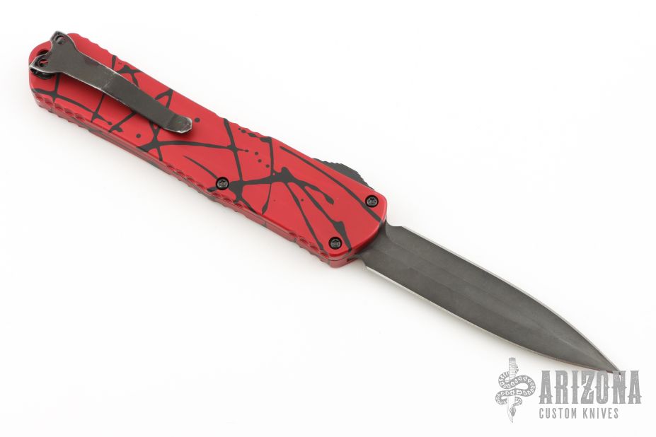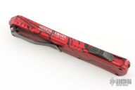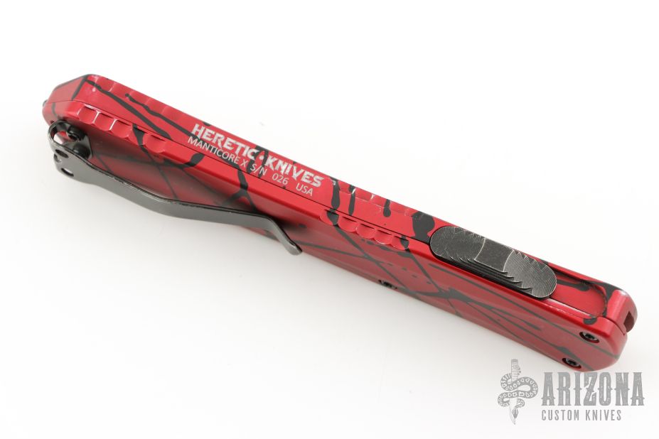 This Manticore-X by Heretic Knives features a DLC double edged blade. The handle has a red aluminum frame with black splash and black stainless steel hardware and tip down clip. Comes with original box. S/N 026. Has a few light scuffs, and the very tip of the blade is chipped, otherwise good condition.