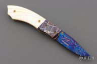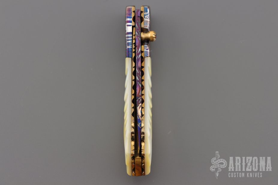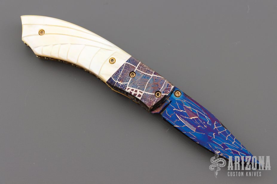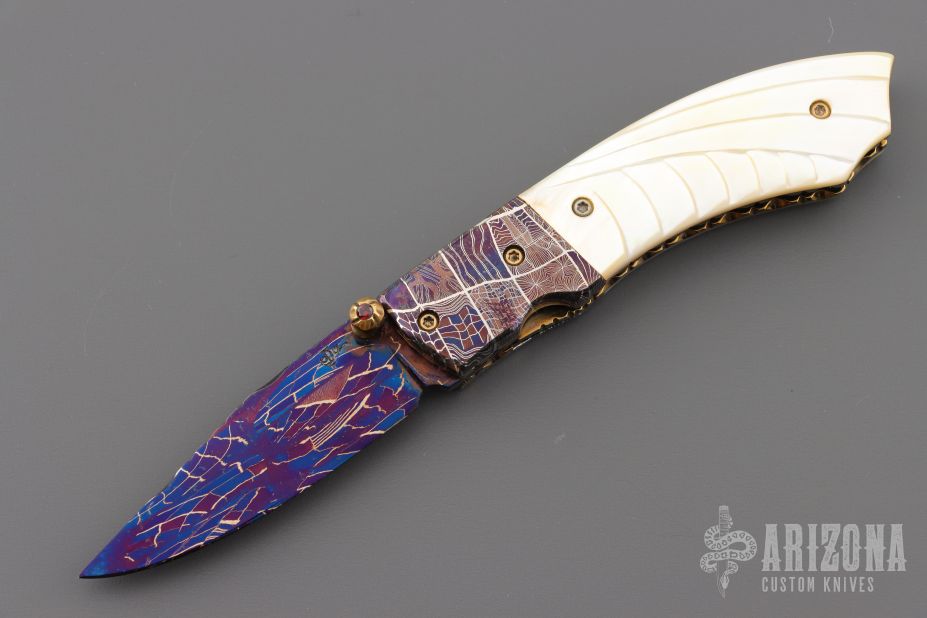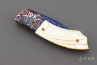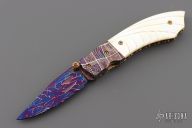 This knife by Suchat Jangtanong features a blued Damascus blade with a single thumbstud with red stone inlay. The handle has carved blued Damascus bolsters, carved gold lip pearl scales, fileworked and anodized titanium liners and backspacer with a gold lip pearl inlays. Comes in a zipper pouch. Excellent condition.
