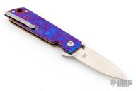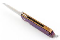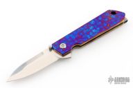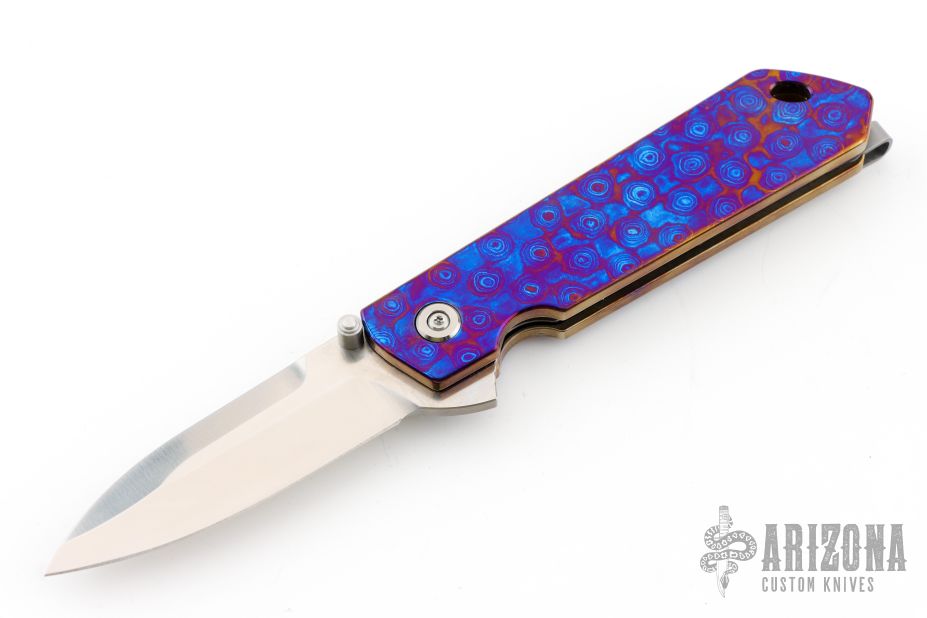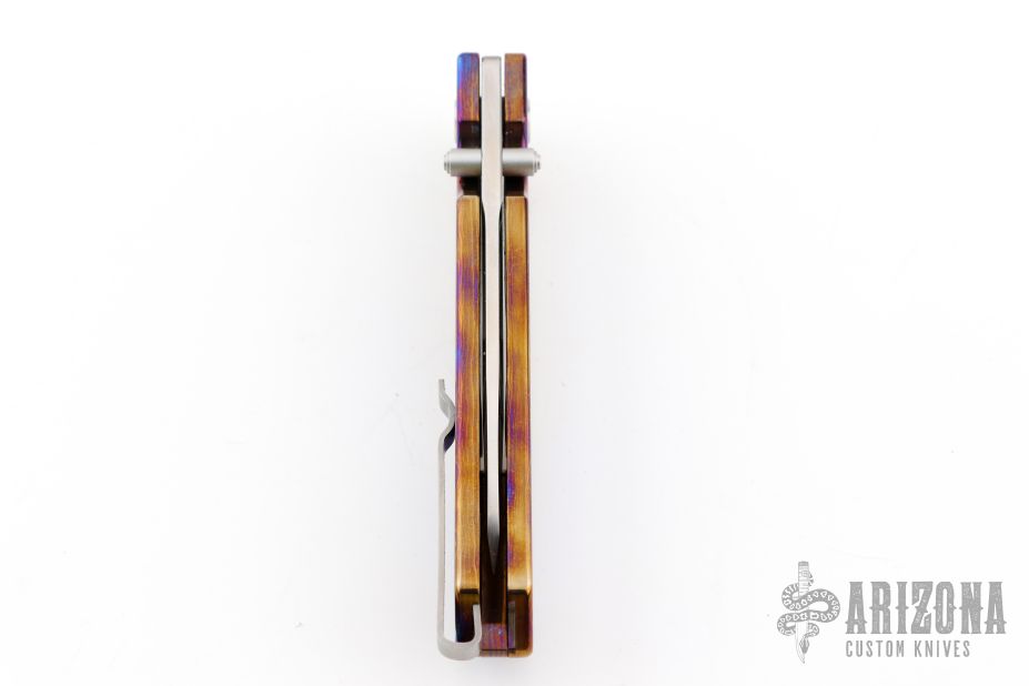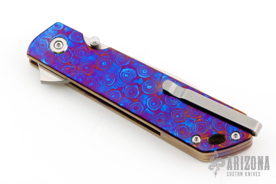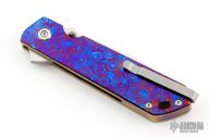 This knife features a satin finished drop point blade with dual thumbstuds. The handle has a timascus frame with a tumbled steel tip up pocket clip. This knife has a double detent locking mechanism. Includes the original box and papers. #XI. Excellent Condition.