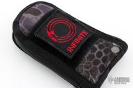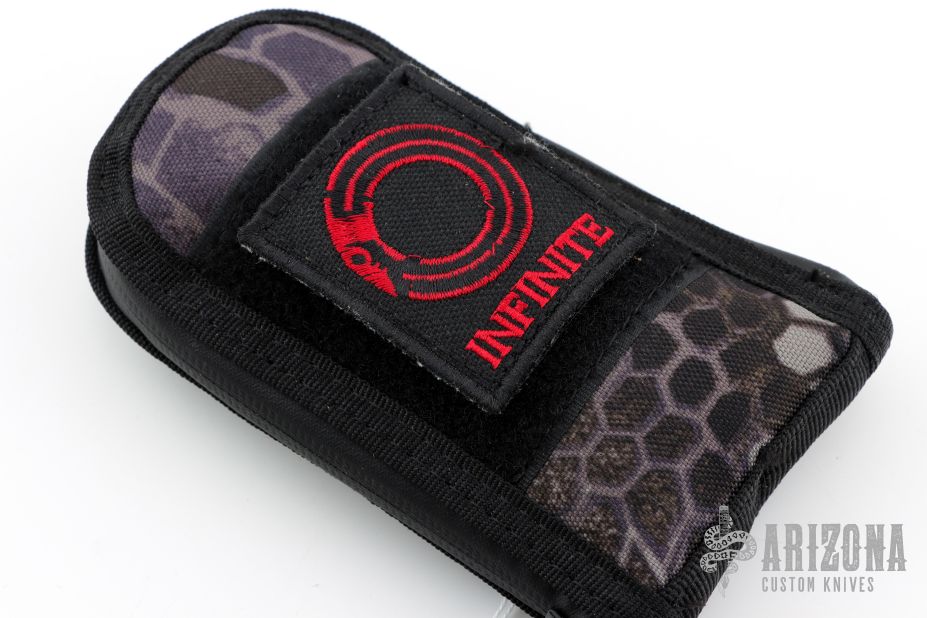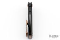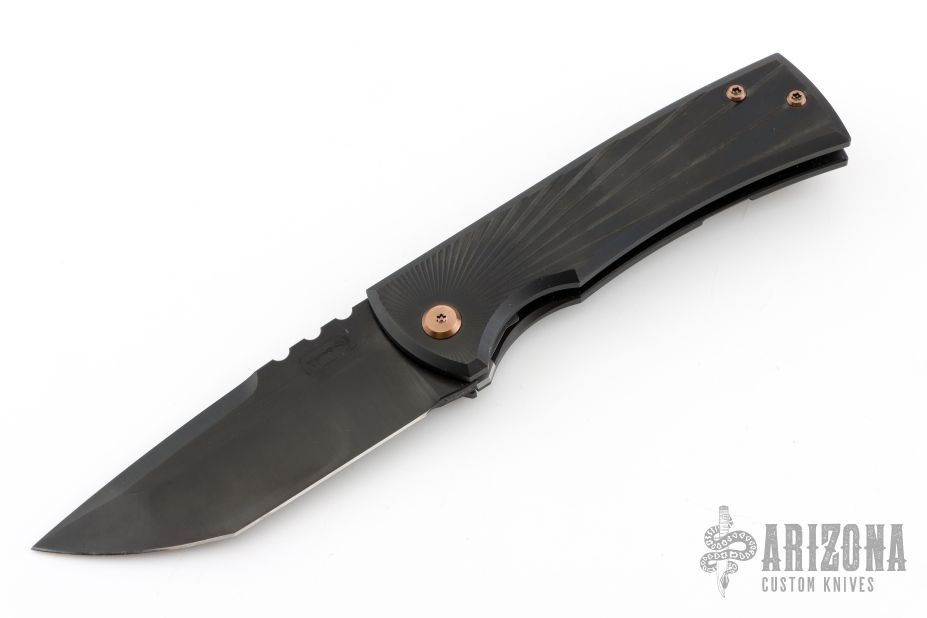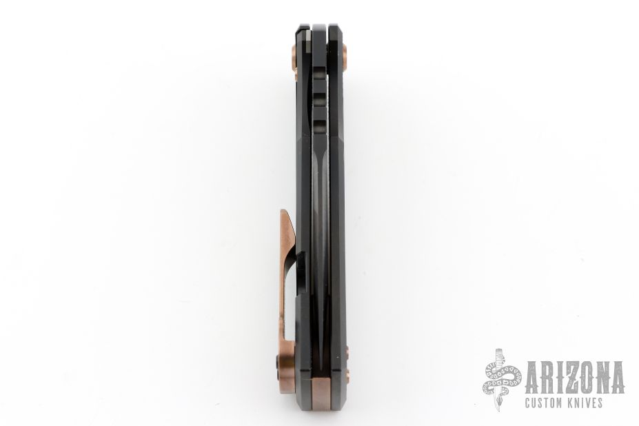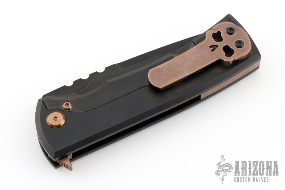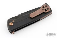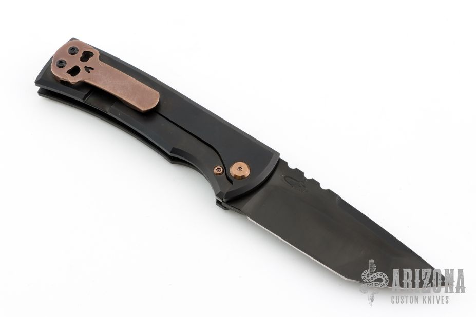 This Chaves Ultramar Redencion Tanto features a black satin finished blade. The handle has a milled black titanium, anodized titanium skull pocket clip (positioned for tip up carry), and a matching titanium backspacer. The knife opens with the use of Lee Williams' Kick Stop flipper.  Includes a zippered case. Excellent condition.