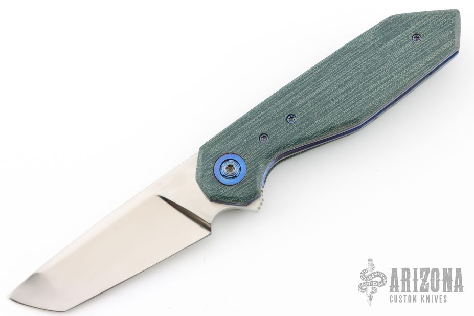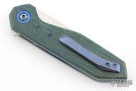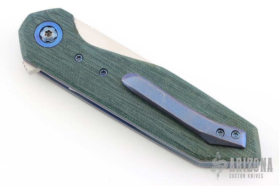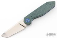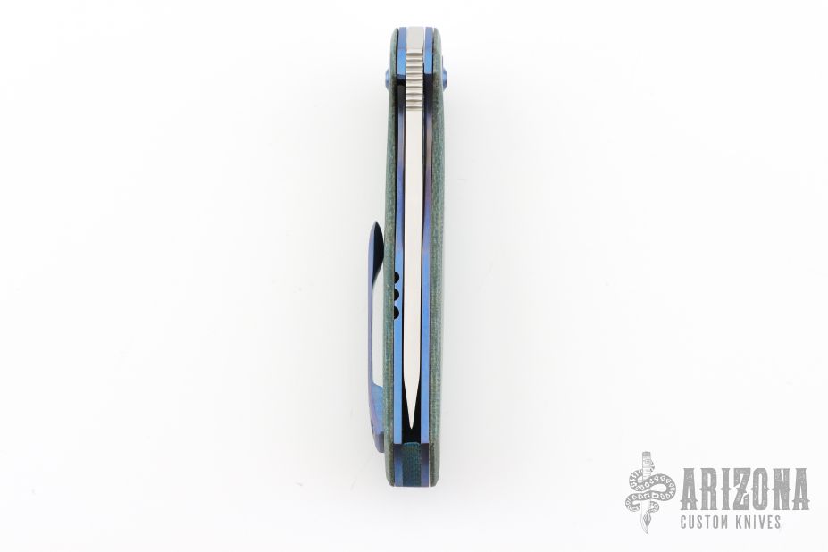 This Laterus by Larevo Knives features a satin finished blade with notched flipper and thumbrest. The handle has canvas micarta scales, titanium liners, micarta backspacer, orange peel and anodized finish titanium tip up clip. Rides on bearings, nice detent and lockup. Comes with COA and zipper case. #017. Has a few light scratches on the clip, excellent condition.