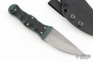This fixed blade from Ken Brock features a stonewashed clip point blade with fileworked spine, textured flats, full tang construction, .111" Blade Stock and 1.283"Blade Depth. The handle has sculpted green and black G-10 scales with brass pins. Comes with a kydex sheath. Excellent condition.