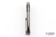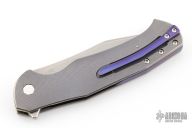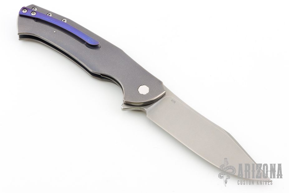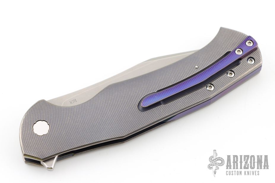 This Mantis Flipper by Herman Knives features a tumbled blade with flipper. The handle has a milled and anodized titanium frame, titanium liner, and tip up anodized titanium clip and backspacer. Nice detent, lockup and blade seating. Rides on bearings. Excellent condition. Comes with a zippered case.