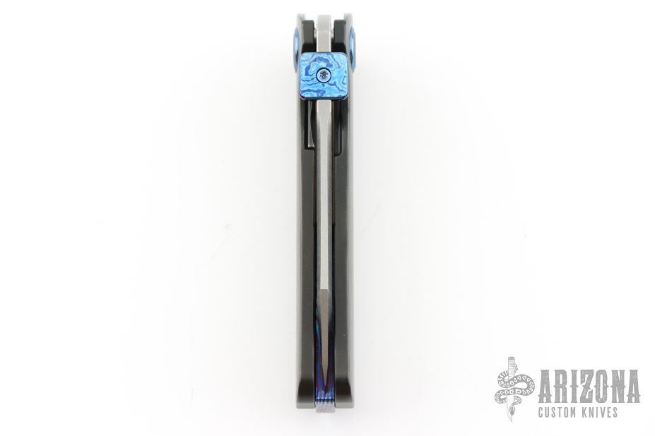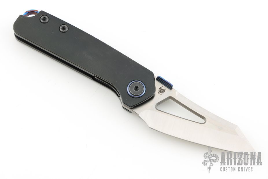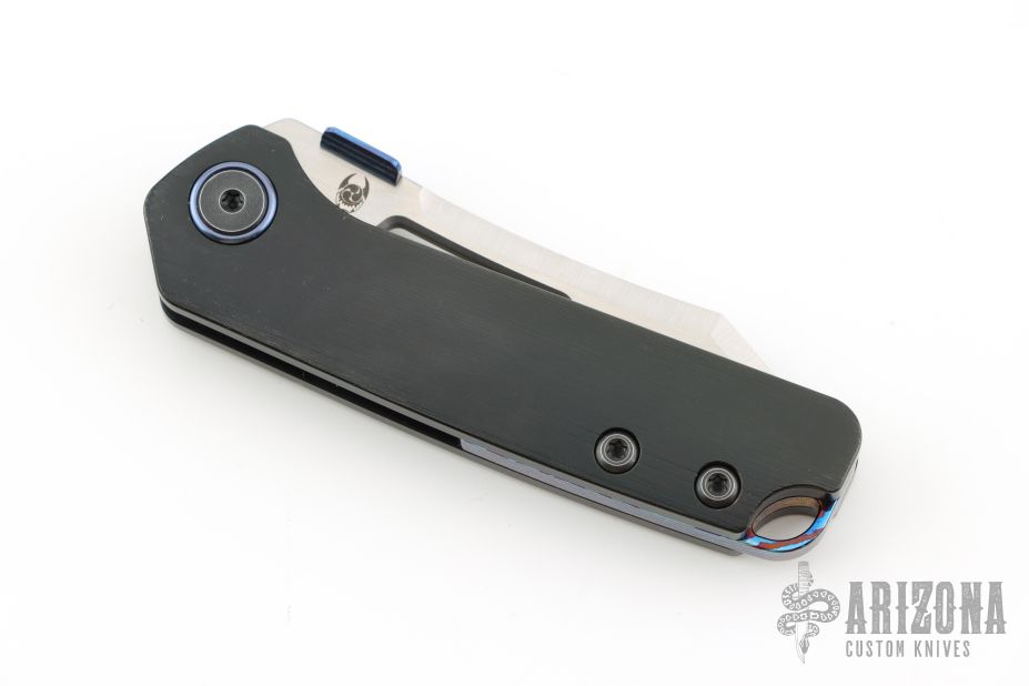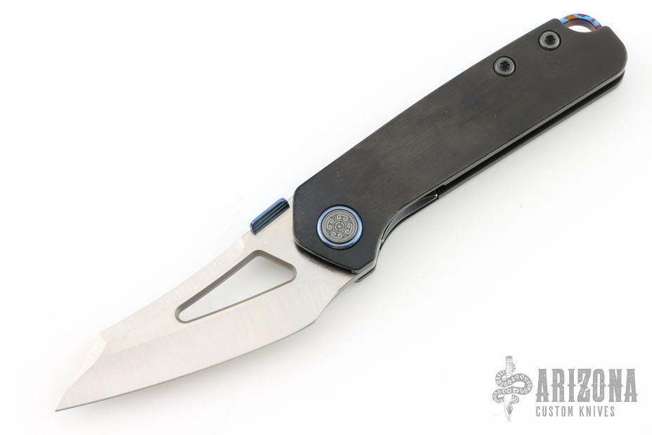 This knife by Cavol Knives features a satin finished blade with a mokuti thumbstud. The handle has a black titanium frame with a mokuti backspacer and anodized pivot collars. Includes the original box and papers. Excellent Condition.