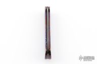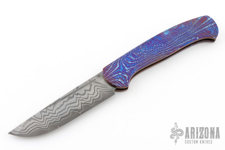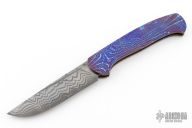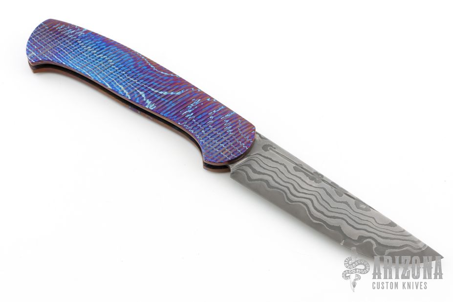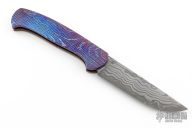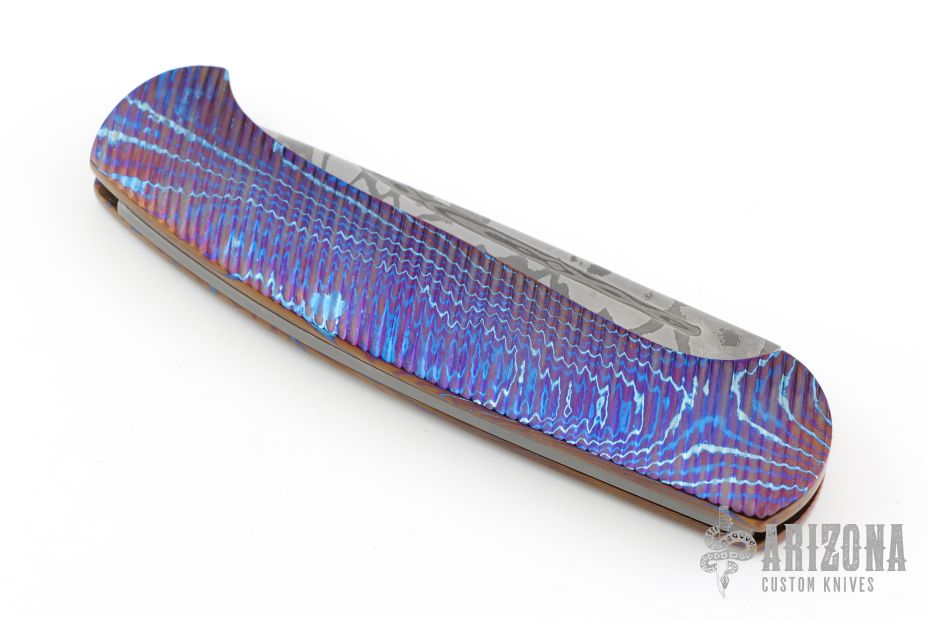 This slipjoint by Roman Ponomarev features an Elmax core San Mai Damascus blade with fullers. The handle has diagonal milled 3-alloy Timascus scales, bead blasted stainless steel spring. Has a few light scuffs otherwise excellent condition. Prototype, one of one.