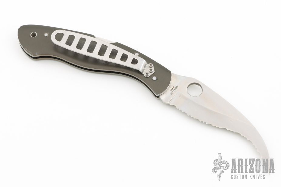 This Civilian lockback folder by Spyderco has a satin reverse "S" fully serrated blade and an aluminum handle with Tuffram coating and non-slip overlay. Stainless steel clip. Has scuffs/scratches otherwise the knife is in good condition.  This knife would make a great user.