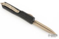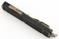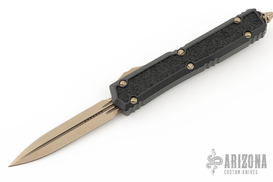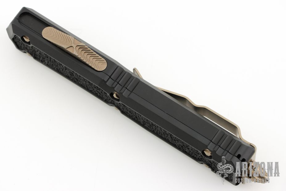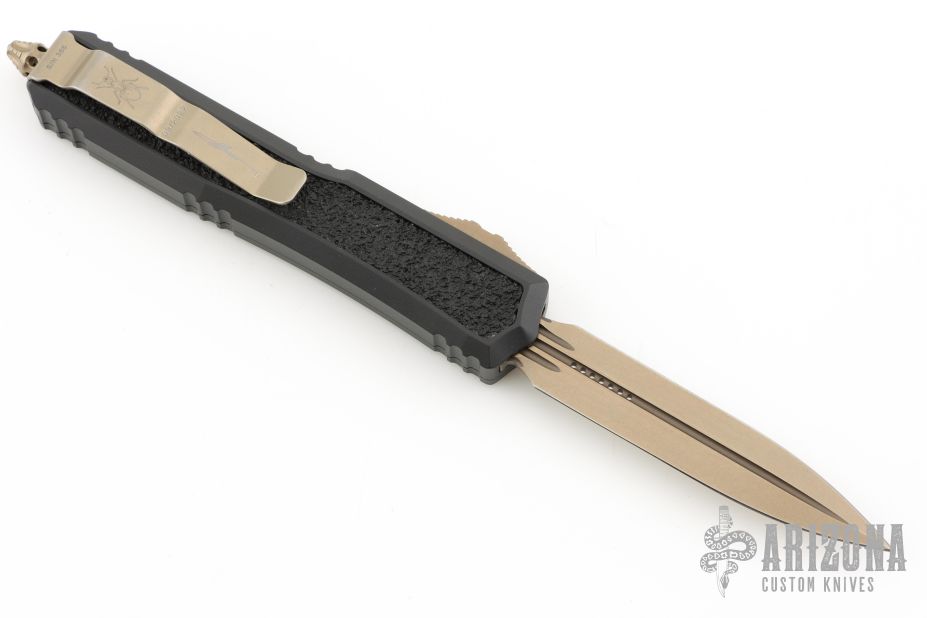 This Makora OTF automatic by Microtech features a bronzed double edge blade. The handle has a black aluminum frame with nonslip inlays. Bronzed stainless steel clip, tip down carry. Dated 03/2022 and S/N 366 on clip. Comes with the original box and papers. Excellent Condition.