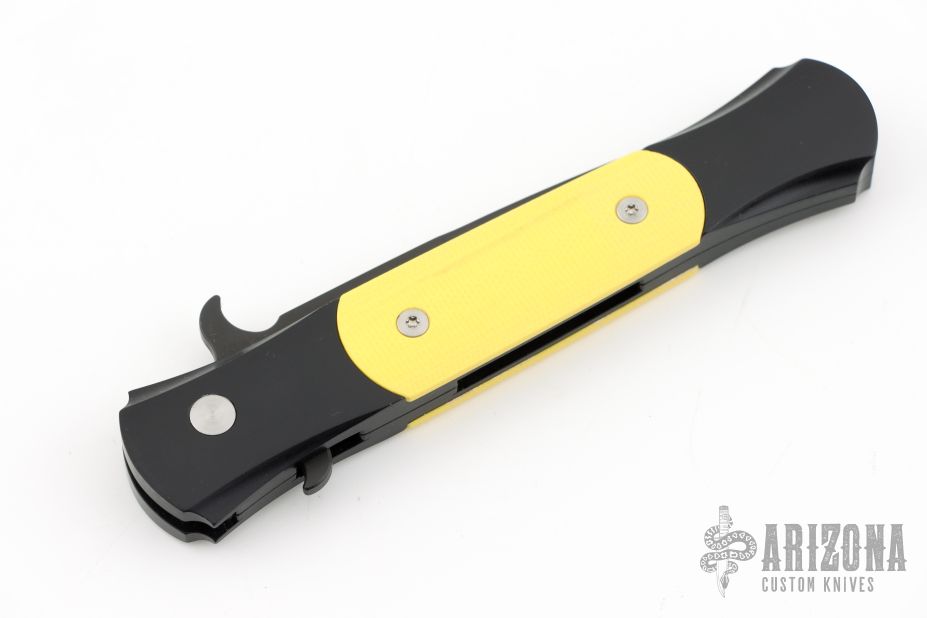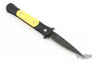 This is a Don featuring a black DLC coated blade, black aluminum handle, and yellow G10 scales.  Excellent condition. PR2_362.