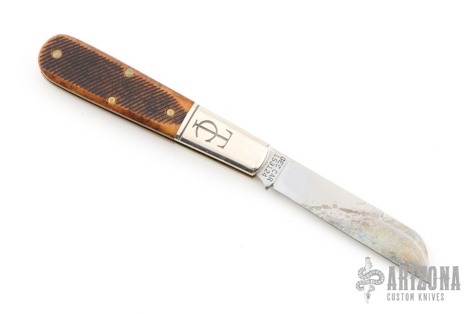 This Barlow by Great Eastern Cutlery features a drop point satin finished blade with nail nick. The handle has nickel silver bolsters, rough sawcut richlite covers, stainless steel liners and stainless steel spring.  Comes with original tube, and button. Has some patina, and some light oxidation in the spring. Otherwise great condition.