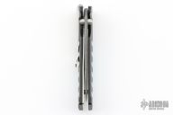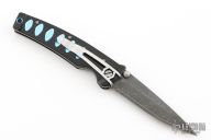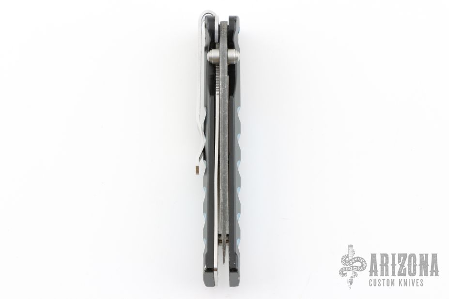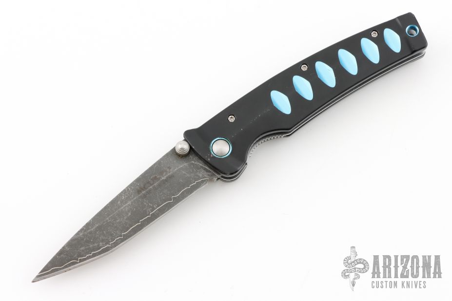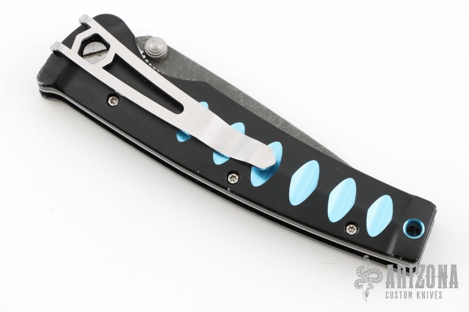This Manual Katana by MCUSTA features a VG-10 San Mai tanto style blade with dual thumb studs. The handle is comprised of a black aluminum frame with blue anodized notches over a single steel liners and stand offs. Deep carry stainless steel clip is positioned for right hand, tip down carry. Has some scuffs and scratches, and a little rusting on the blade edge, good condition otherwise.
