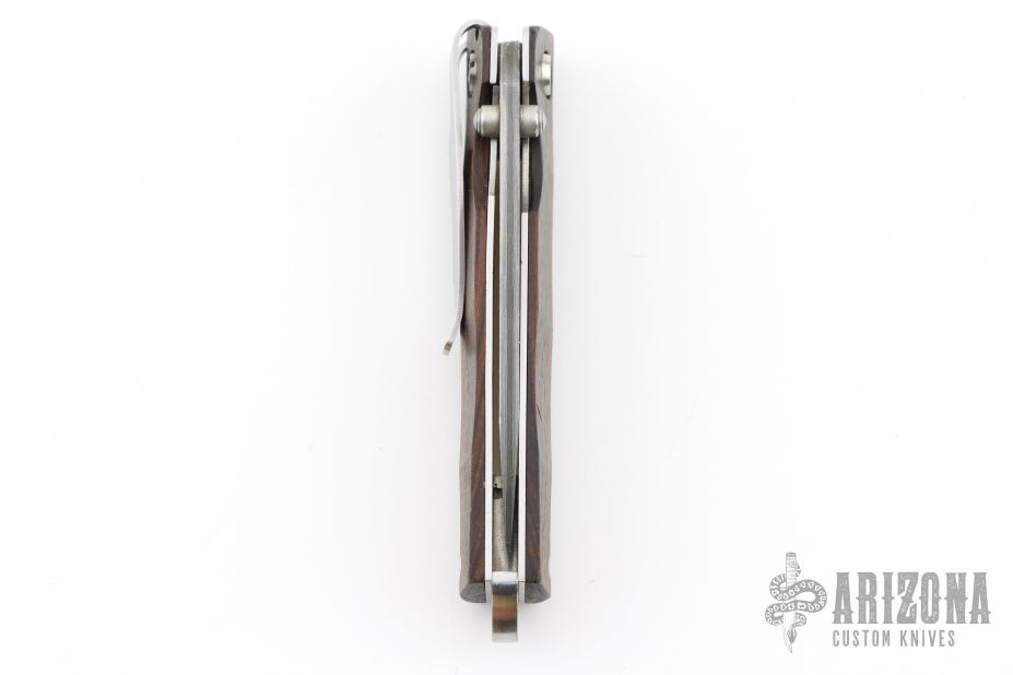 This linerlock folder by Mcusta features a VG-10 core San Mai Damascus blade marked "MCUSTA, SEKI JAPAN". Wood scales with stainless steel liners and tip down clip. Has some scuffs and scratches good condition otherwise.