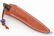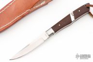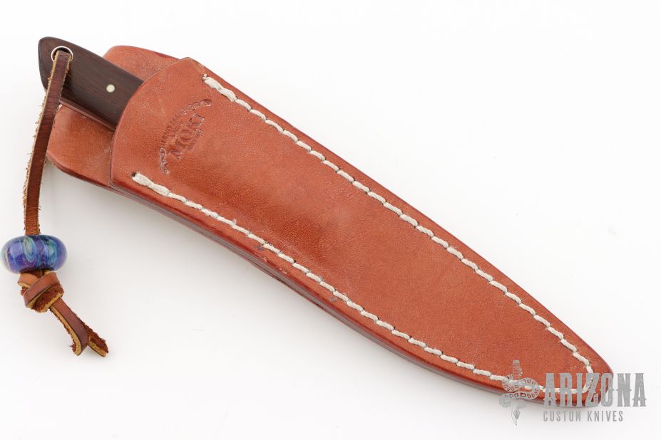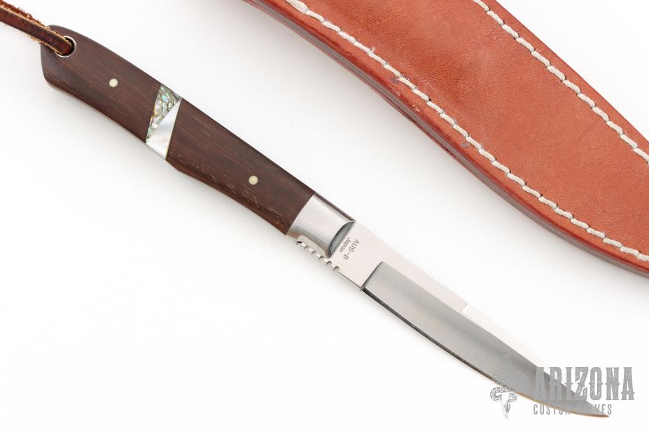 This Bird and Trout by Moki features a satin finished blade, .117" blade stock, .568" blade depth, full tang construction. The handle has steel bolsters, wood covers, pearl inlays and lanyard hole. Comes with a leather belt sheath. Has some light scuffs, excellent condition otherwise.