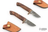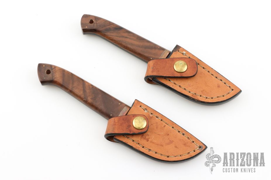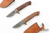 This pair of knives by Raymond Johnson features a Damascus drop point blade with .1" blade thickness and 1.109" blade depth. The handle has hidden tang construction with copper guards, micarta frames, pinned wood grip with copper pins and lanyard hole. Comes with leather sheath. Has patina and scuffs, great condition otherwise.