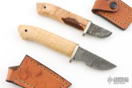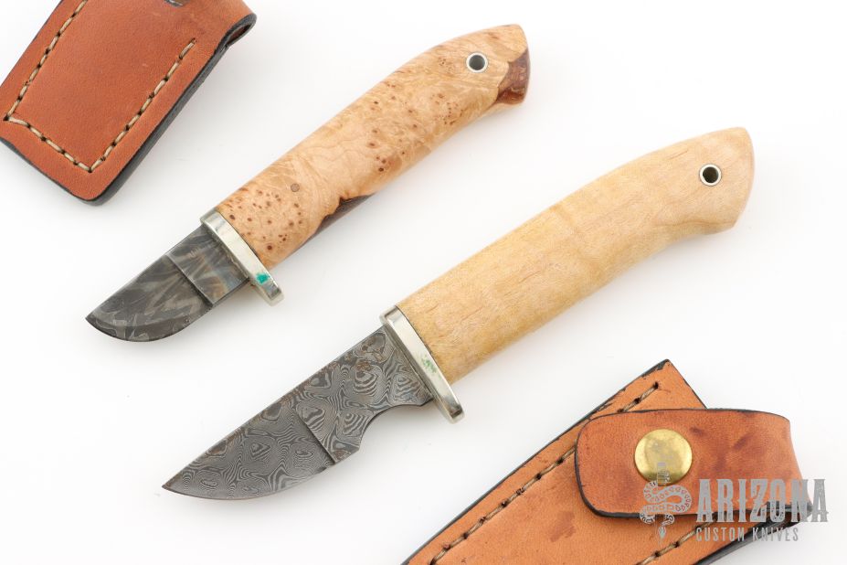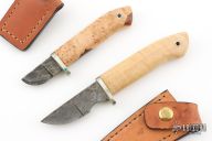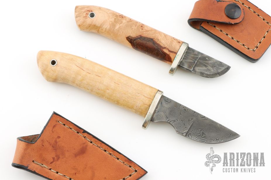 This pair of knives by Raymond Johnson features a Damascus drop point blade with .1" blade thickness and 1.109" blade depth. The handle has hidden tang construction with nickel silver guards, pinned wood grip and lanyard hole. Comes with leather sheath. Has patina and scuffs, great condition otherwise.