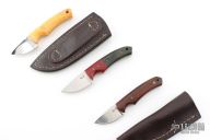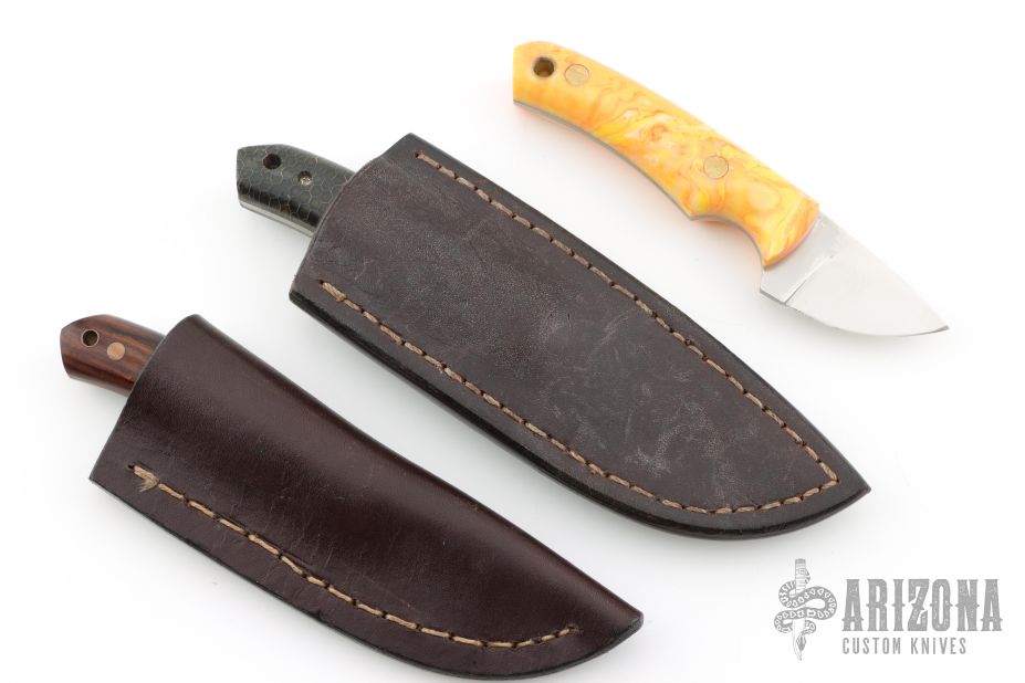 This lot of knives by Raymond Johnson features a satin finished drop point blade with .108" blade thickness and 1.04" blade depth. The handle has full tang construction with various grips and lanyard hole. Comes with TWO leather sheaths. Has patina and scuffs, great condition otherwise.