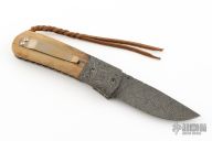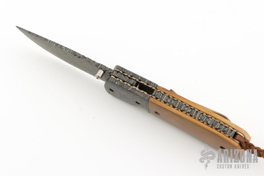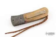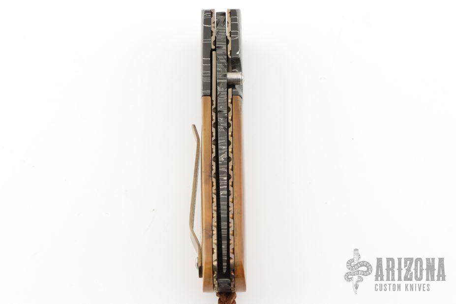 This C-Mo Linerlock by Mark Nevling of Burr Oak Knives features a Mosaic Damascus (1084, 01 Tool Steel, L6 and 15n20) blade with a single thumbstud and a fileworked spine. The handle has Mosaic Damascus bolsters, Mammoth Ivory scales, fileworked and anodized titanium liners, fileworked Mosaic Damascus backspacer, tip up anodized titanium clip. Comes with a zippered pouch and COA dated 9/25/25. New from maker!