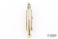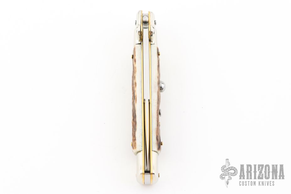 This Picklock by Frank Beltrame features a mirror polished bayonet ground blade with false top edge. The handle has nickel silver bolsters, stag scales, brass liners and a stainless steel backspacer/lock. Excellent condition. 2023 Limited Edition, and comes with a leather pocket sheath. This one was tuned by Greg's Effects and has a COA.