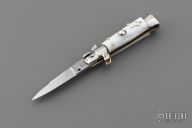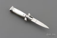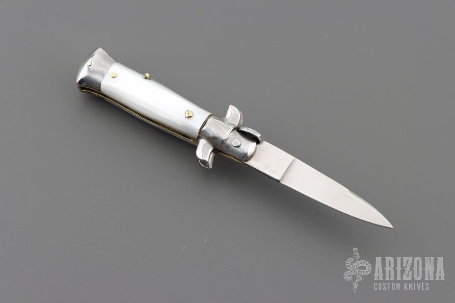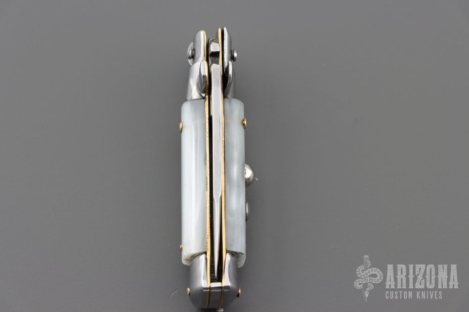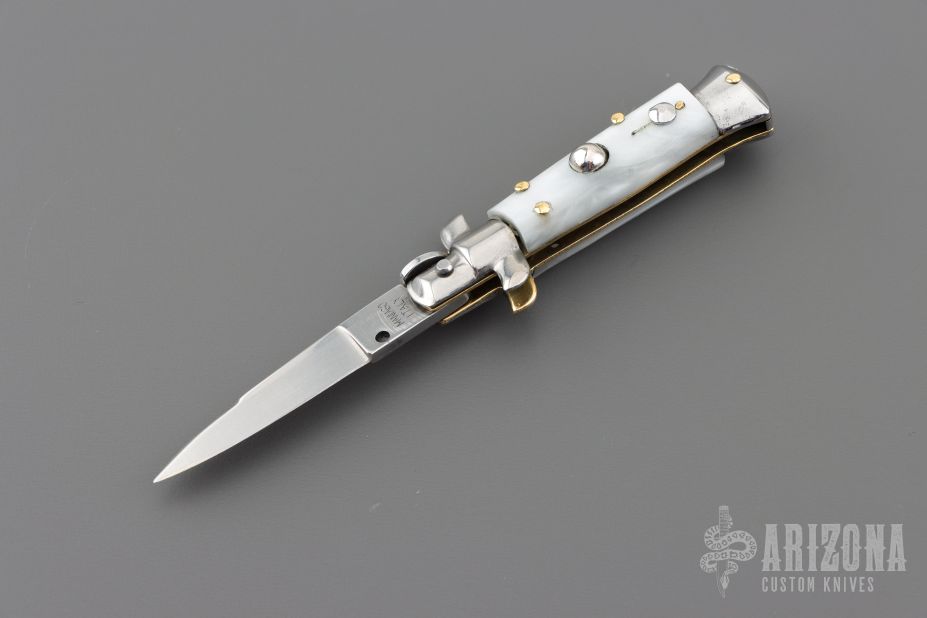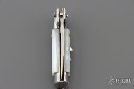 This small picklock features a stonewash/polish finished blade with swedge. Stainless steel front and rear bolster and pearlex scales. Brass liners. Nice function, strong firing. Excellent condition. This one was tuned by Greg's Effects and has a COA.