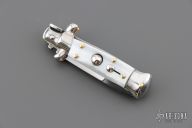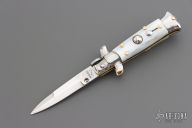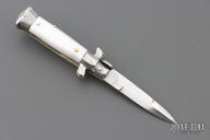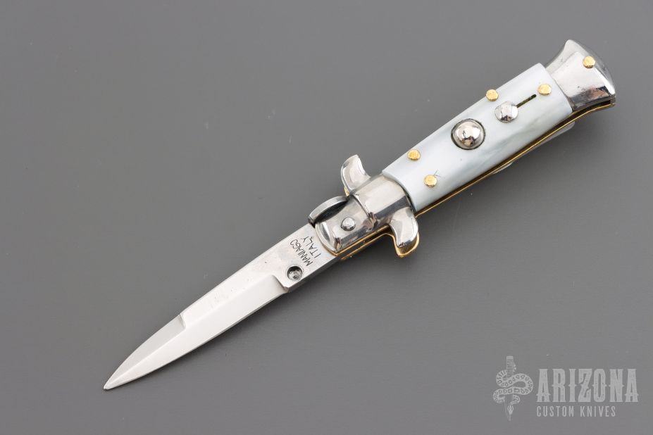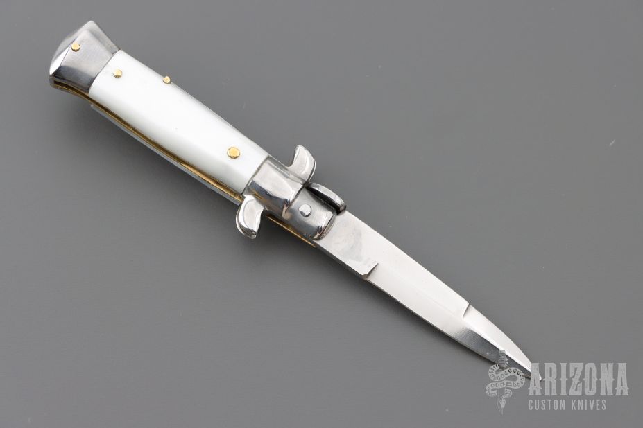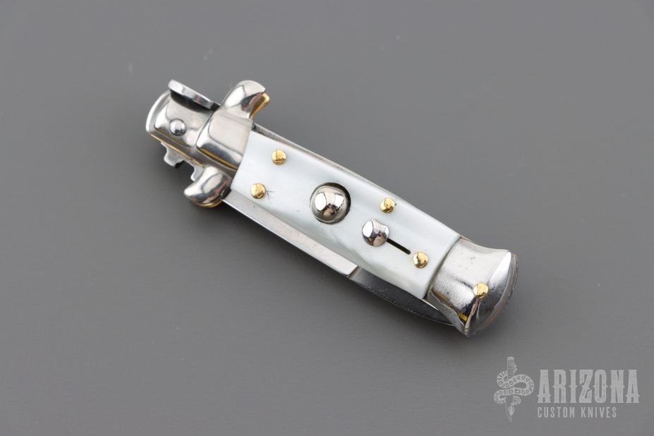 This small swivel bolster features a stonewash/polish finished blade with swedge. Stainless steel front and rear bolster and pearlex scales. Brass liners. Nice function, strong firing. Excellent condition. This one was tuned by Greg's Effects and has a COA.