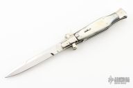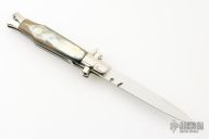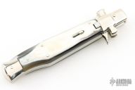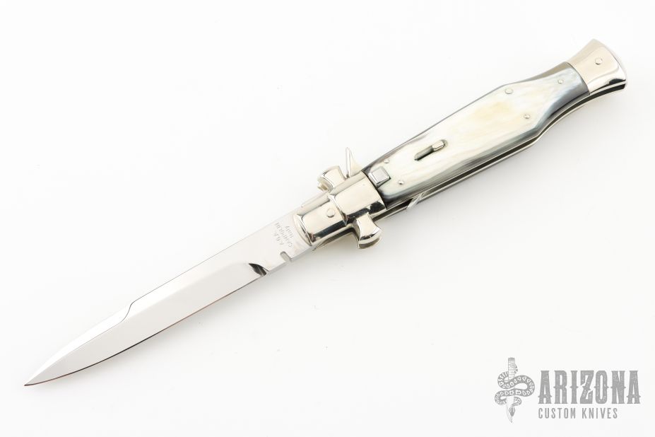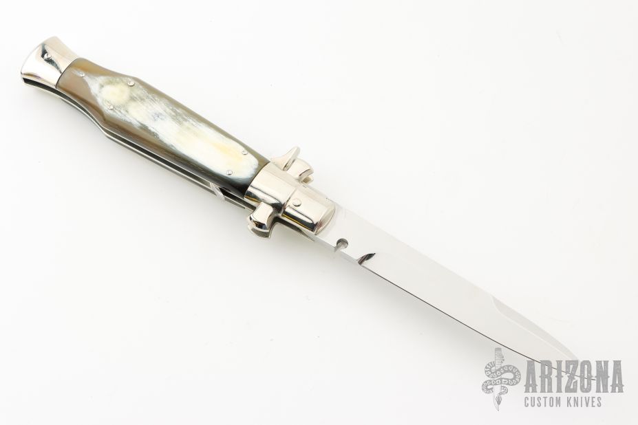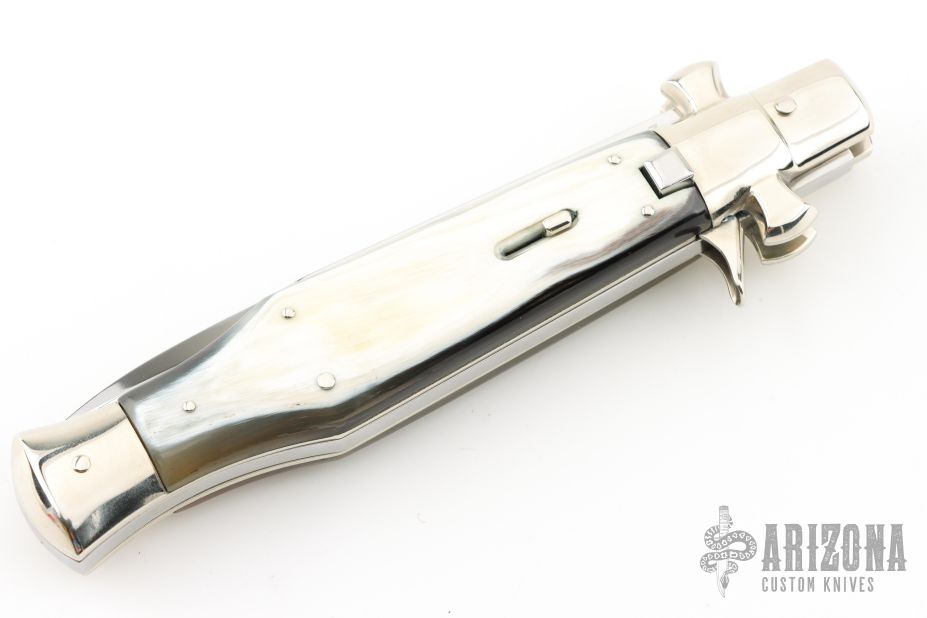 AGA Campolin 11" Blackwidow with Brazil Horn! This Campolin made automatic knife has solid nickel silver bolsters with maltese cross in the hilt. To close this one you use the lock back release at rear of the handle. This makes for very tight and stable construction and it's a bit more robust because of that. Has a mirror polished blade with false top edge. The nickel silver liners and a stainless steel backspacer. Includes a leather pocket sheath and COA from maker. This one was tuned by Greg's Effects and has a COA.  Excellent condition.