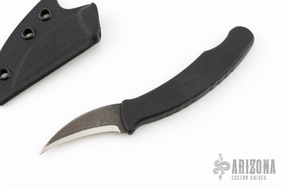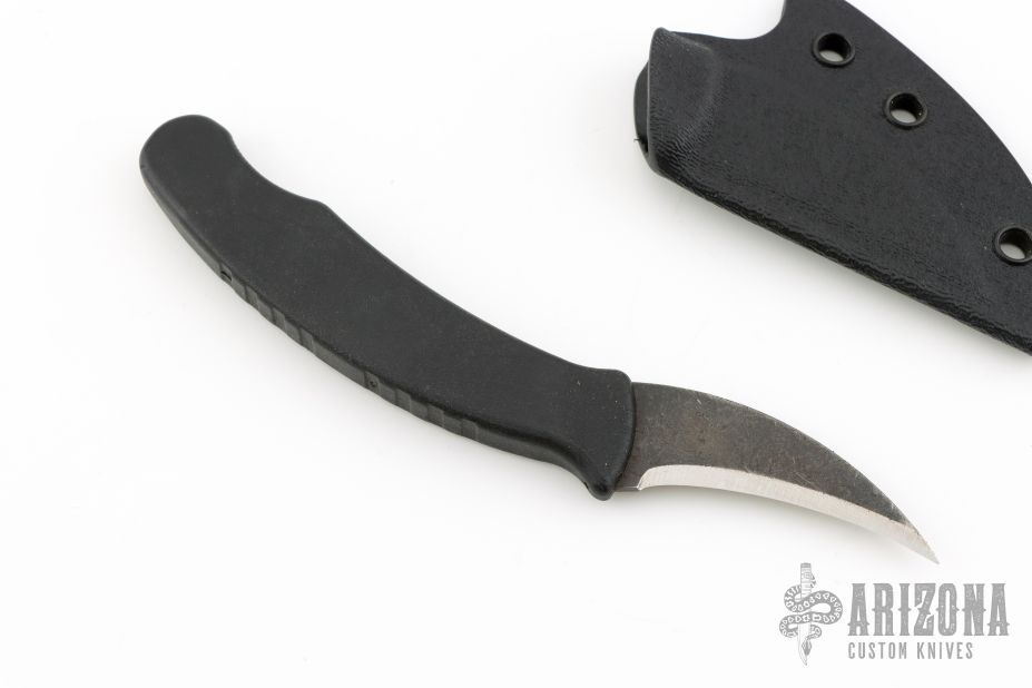 This L-via by Kopis Design features a bead blast and tumble finish hawkbill blade with .061" blade stock and .784" blade depth, hidden tang construction. The handle is glass filled nylon. Comes with a kydex sheath and original box. Excellent condition.