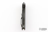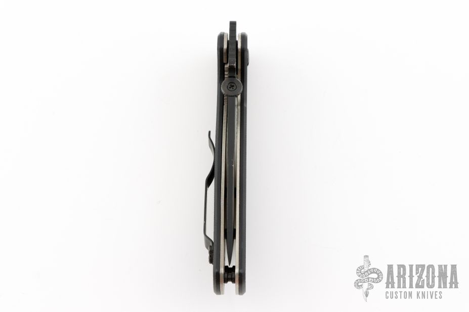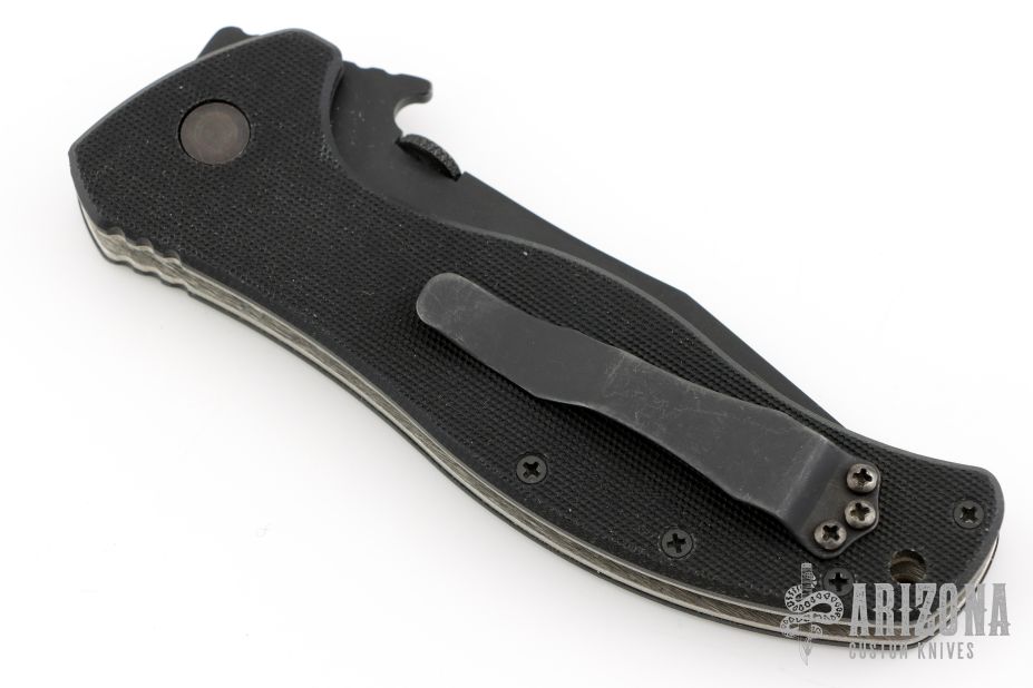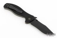 This Vindicator by Emerson Knives has a black recurve blade with thumb disc, wave feature and notched thumb rest. Handle is black G10 with titanium liners, black G-10 backspacer, lanyard hole and tip up black stainless steel clip. Nice detent, lockup and blade seating. Comes with an Emerson Box and papers. Comes with an extra American Flag clip. Has a couple of small nicks in the blade edge, otherwise excellent condition.