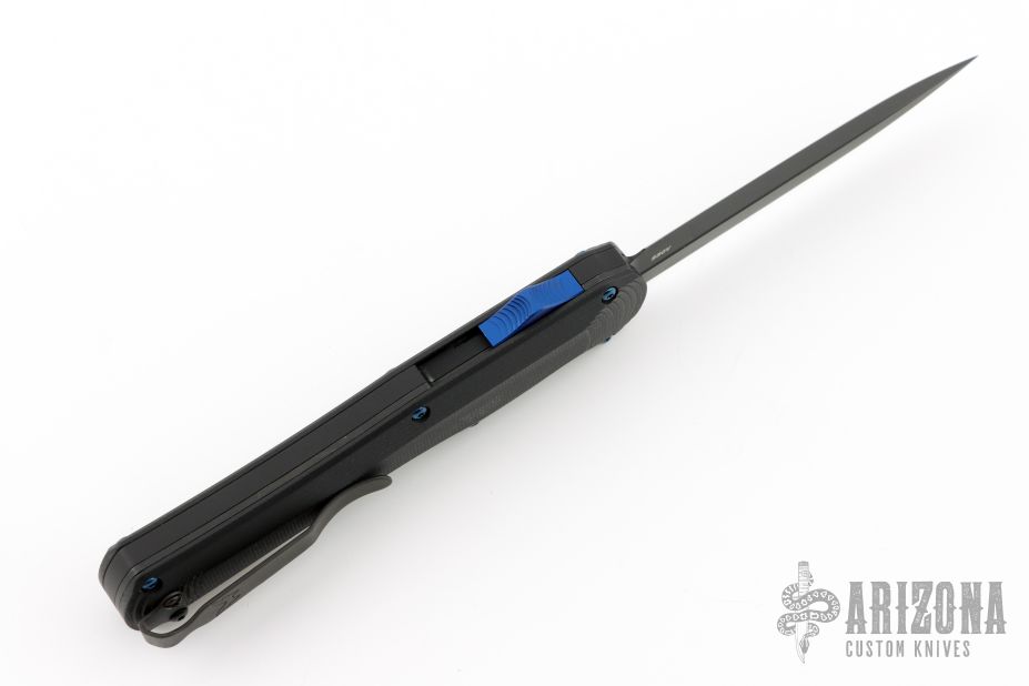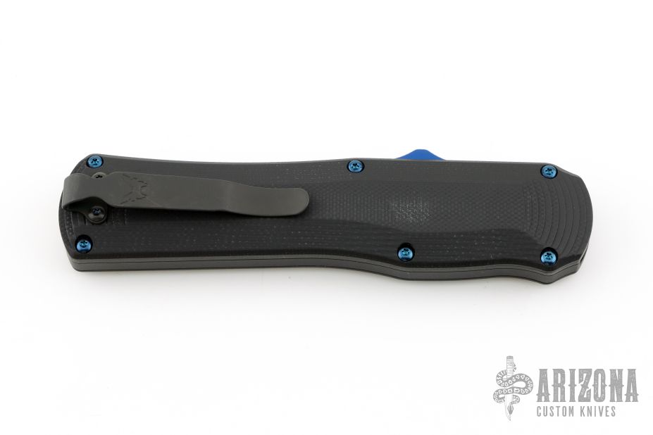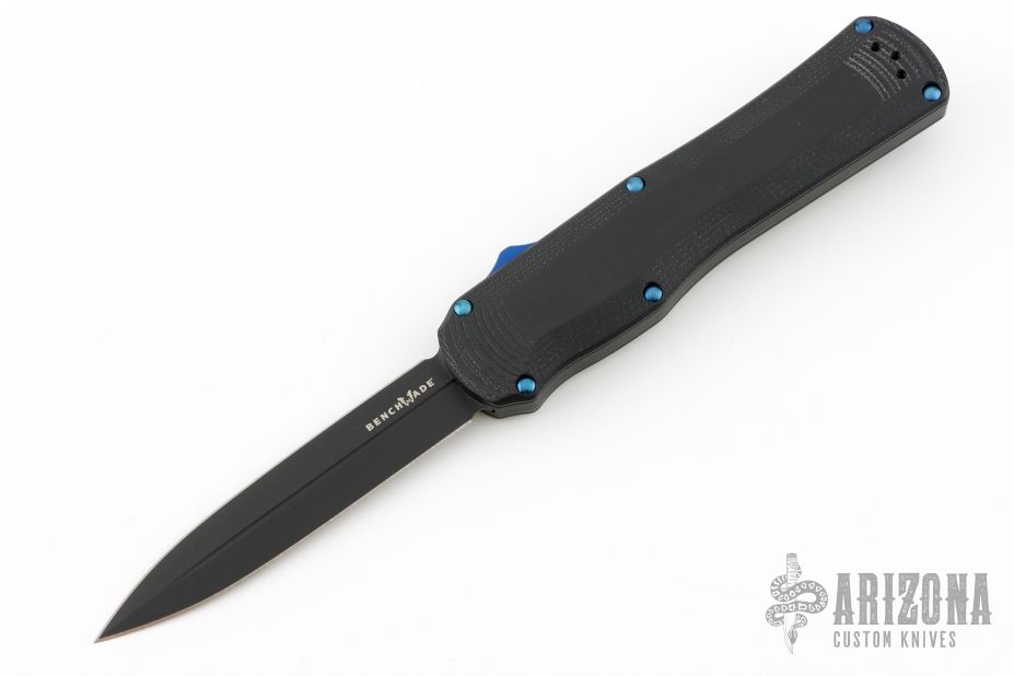 This Autocrat model has a black G-10 handle and a black finished dagger blade. The Autocrat is the first OTF offering from Benchmade featuring a milled composite G-10 handle. It is a high performance tactical auto, defined by both speed and style. The ergonomic handle successfully blends the durability and wear resistance of G-10, black coated hardware and components. Item comes complete with a reversible deep-carry pocket clip. Features: Spine-fire release OTF automatic action for rapid, one-hand deployment. Reversible tip-down pocket clip allows for left or right side ambidextrous carry. Premium CPM-S30V double-edge dagger blade provides excellent strength and edge retention. Comes with original box, drawstring pouch, and papers. Excellent condition.