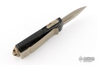 This Microtech Exocet features a bronze finish spear point blade. The handle has a black aluminum handles and a stainless clip that doubles as a money clip dated 10/2022 s/n 21898. Comes with original box and papers. Excellent condition.