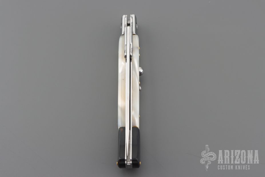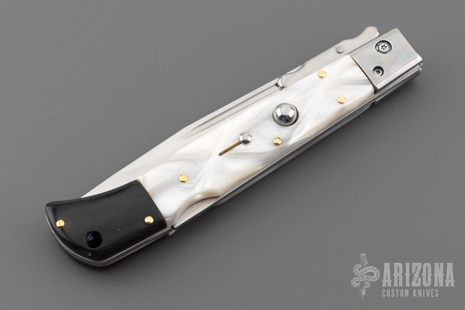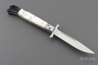 This Swing Guard Lockback Auto by AKC Italy has a polished stainless steel blade with fullers. The handle has pearlex scales with stainless steel bolsters, dymondwood rear bolsters, stainless steel liners, and stainless steel back spacer and lock.  This knife has been professionally tuned and polished by Greg's Effects.  Includes a leather sheath and box. Excellent Condition.