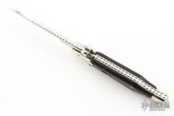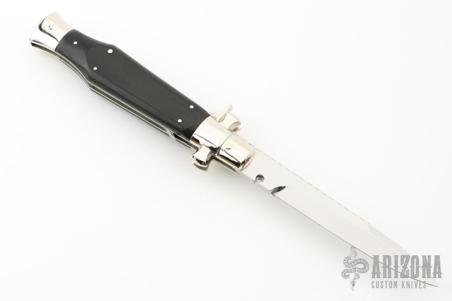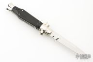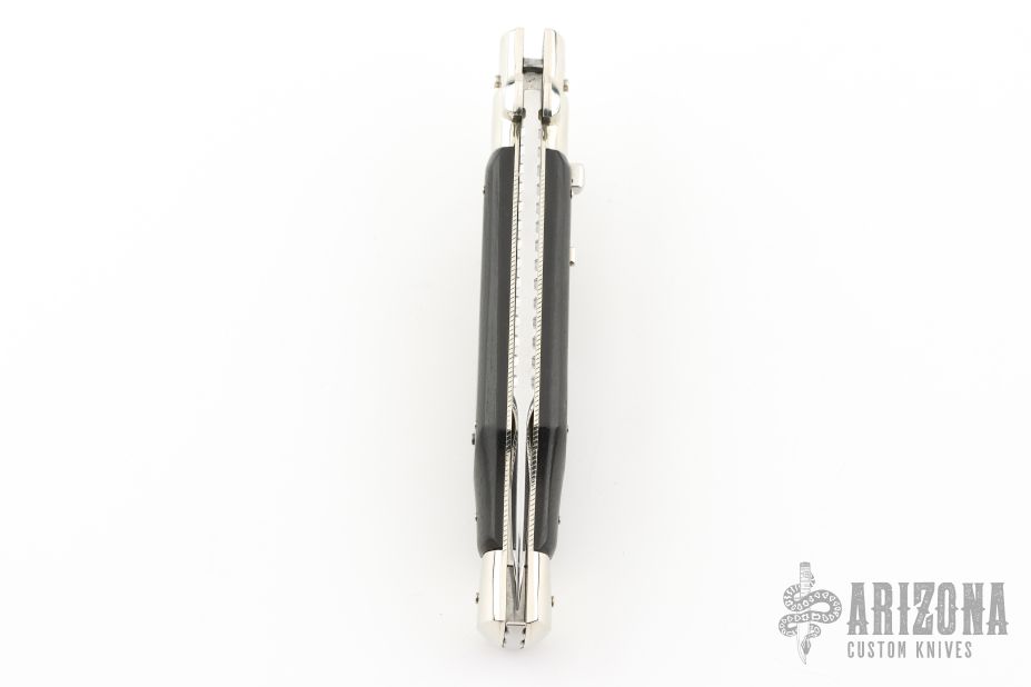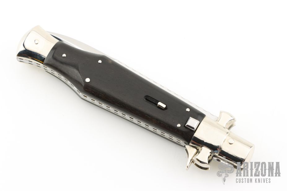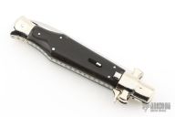 AGA Campolin 11" Blackwidow with Ebony! This Campolin made automatic knife has solid nickel silver bolsters with maltese cross in the hilt. To close this one you use the lock back release at rear of the handle. This makes for very tight and stable construction and it's a bit more robust because of that. Has a mirror polished blade with false top edge. The nickel silver liners and a stainless steel backspacer. Comes with leather slip, deluxe wood box and Certificate. This one was tuned and polished by Greg's Effects and has a COA. Blade spine, spring, and liners have been nicely file-worked and coin-edged. Excellent Condition.