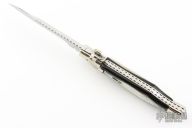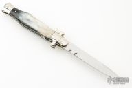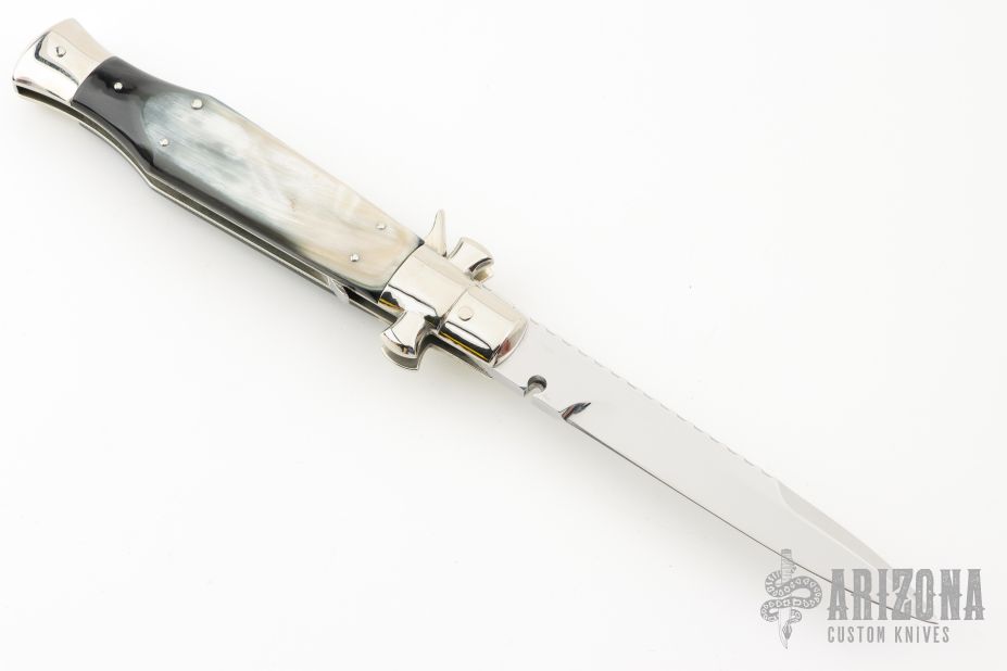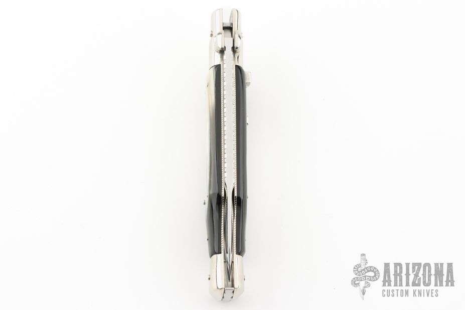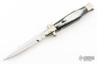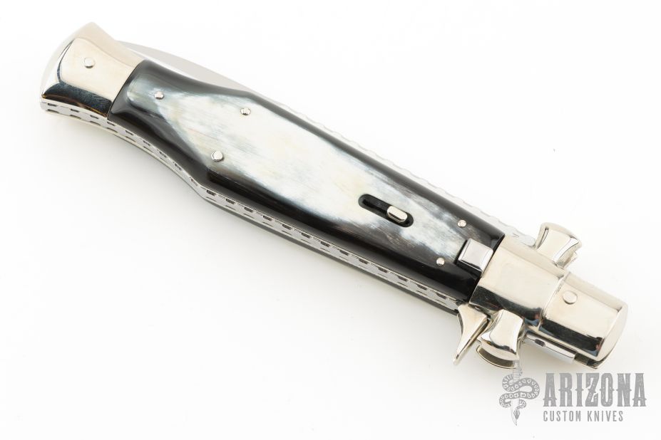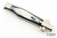 AGA Campolin 11" Blackwidow with Brazilian Horn! This Campolin made automatic knife has solid nickel silver bolsters with maltese cross in the hilt. To close this one you use the lock back release at rear of the handle. This makes for very tight and stable construction and it's a bit more robust because of that. Has a mirror polished blade with false top edge. The nickel silver liners and a stainless steel backspacer. Comes with leather slip, deluxe wood box and Certificate. This one was tuned and polished by Greg's Effects and has a COA. Blade spine, spring, and liners have been nicely file-worked and coin-edged. Excellent Condition.