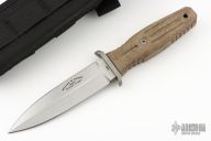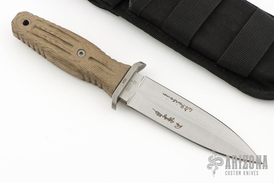 This Applegate-Fairbairn Premium Edition Combat Dagger (#024) has a stonewashed N690 stainless steel D/E spear point blade with hidden tang. Etched signatures on front and back (including Bill Harsey on the back) Blade stock is .180", depth is 1.130". Handle is non-slip green canvas micarta with contoured grooves, tumbled aluminum guard, and lanyard hole. Comes with a nylon sheath. Excellent condition.