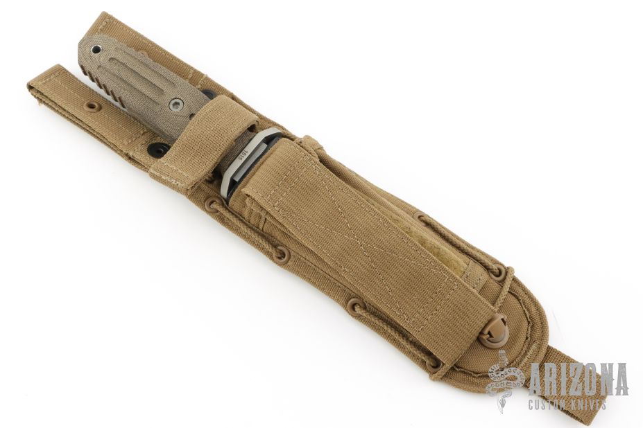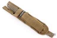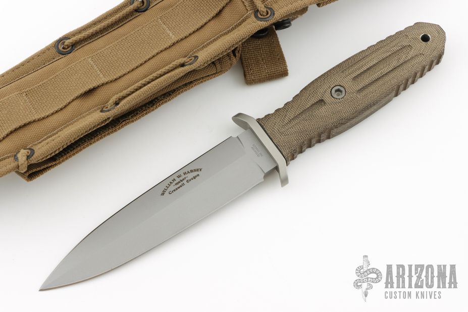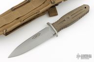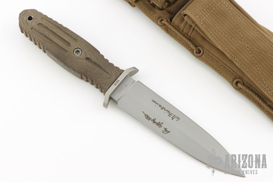 This Applegate-Fairbairn Premium Edition Combat Dagger (#1515) has a bead blast 440C stainless steel D/E spear point blade with hidden tang. Etched signatures on front and back (including Bill Harsey on the back) Blade stock is 3/16", depth is 1-1/16". Handle is non-slip green canvas micarta with contoured grooves, bead blasted aluminum guard, and lanyard hole. Comes with deluxe spec ops nylon over Kydex sheath. Excellent condition.
