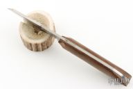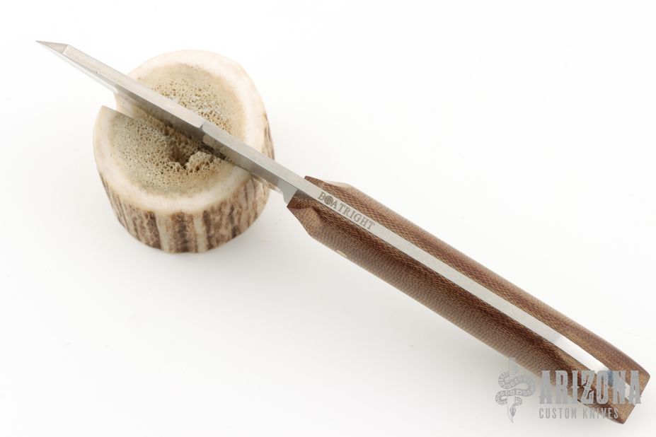 This Moraine by Boatright Bladeworks features a satin finished blade with .125" blade stock and 1.15" blade depth, full tang construction. The handle has canvas micarta scales with a brass pin and lanyard hole. Comes with makers card. Has a couple very light scratches, otherwise excellent condition.