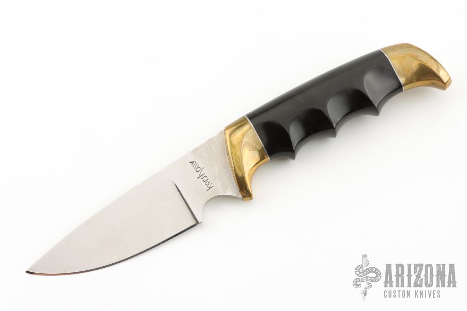 This Model 1030 Deer Hunter by Kershaw Knives features a mirror polished drop point blade with notched thumbrest, .161" blade stock and 1.195" blade depth, hidden tang construction. The handle is comprised of brass guard and pommel, steel spacers and hand contoured phenolic handle. This model has been discontinued. Has some light scratches and patina. Great condition otherwise.