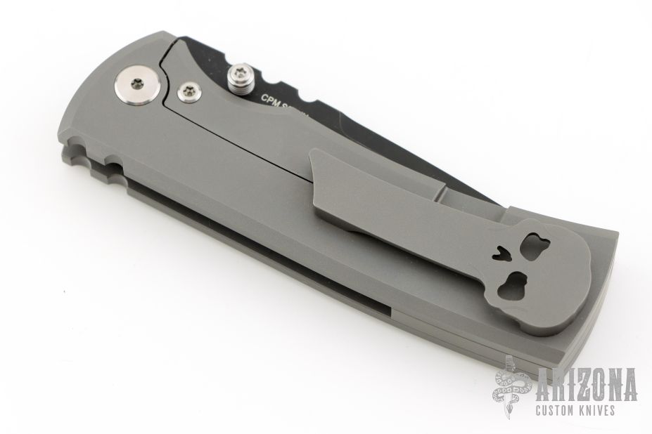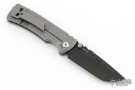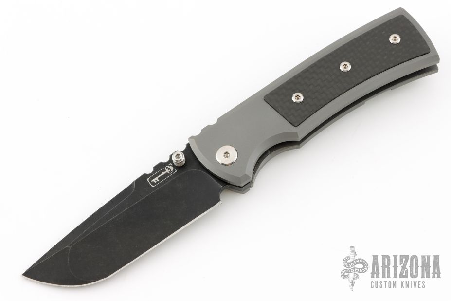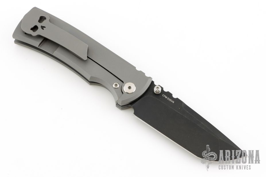 This Chaves Ultramar Redencion Street Tanto features a black coated, CPM S35VN tumbled tanto blade with the Chaves logo. The handle is made up of bead blasted titanium scales with carbon fiber inlay on the presentation side, skull pocket clip with hidden screws (positioned for tip up carry), and matching titanium backspacer. Nice detent, lockup and blade seating. This piece is in excellent condition with no signs of use or carry. Comes in the original packaging.