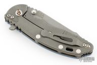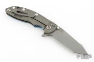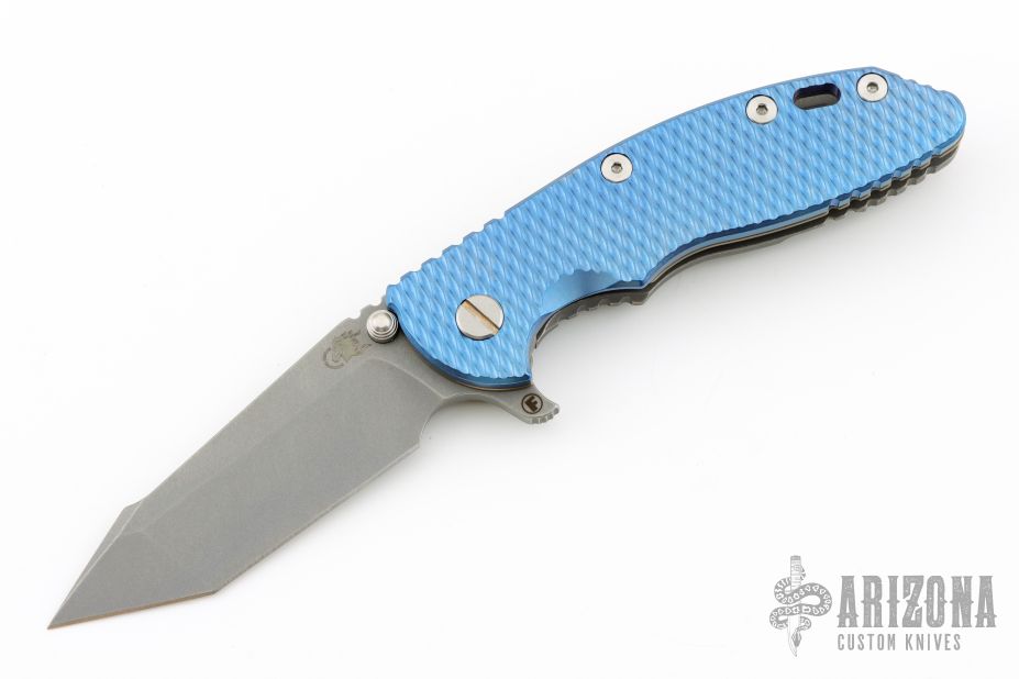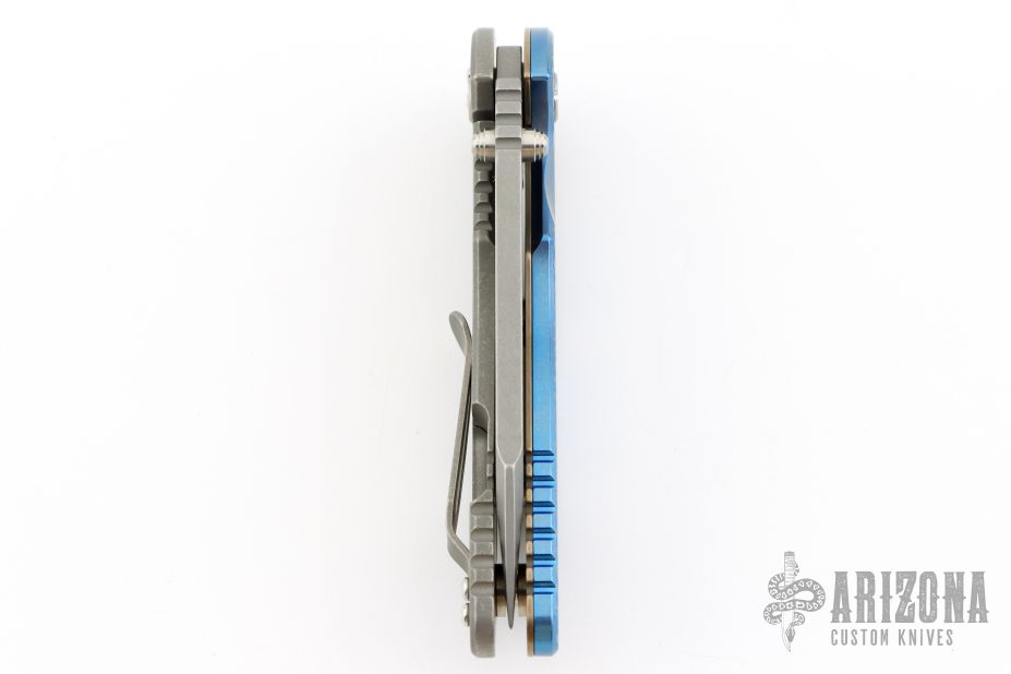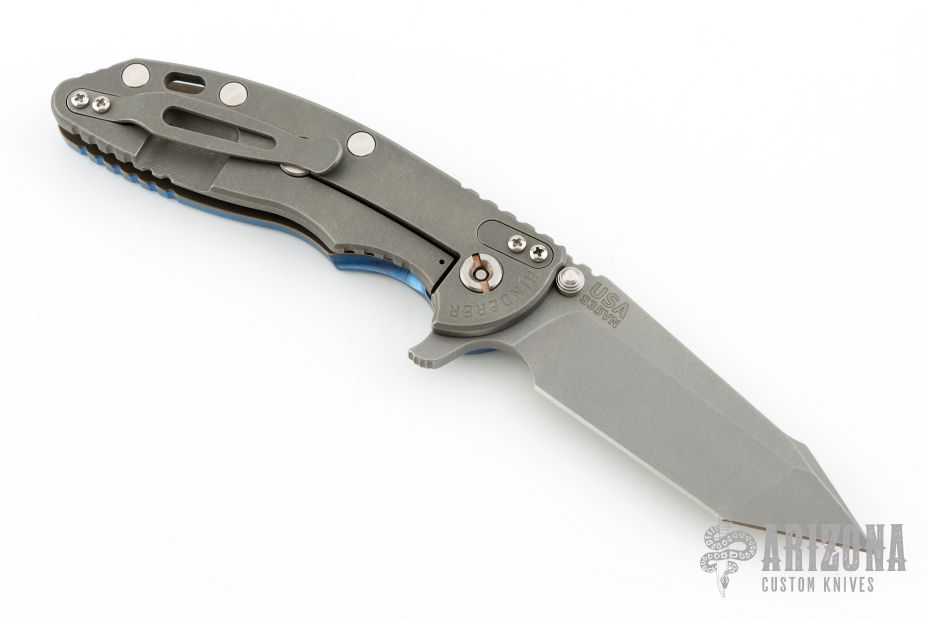 This 3.5" Harpoon Tanto ground FATTY XM-18 from Rick Hinderer features a working finished, .186" thick blade with notched thumbrest, dual thumb studs and flipper. The handle is comprised of a blue textured titanium "A" side, a bronzed liner, working finished titanium lockside with matching tip up/tip down clip and filler tab. This is an XM-18 built on XM-24 hardware. A thick beast of a knife! Great blade seating, detent and lock up. Comes with original box (handwritten model info on the side of the box), card, original tan G10 scale, and three bronze anodized screws. Excellent condition.