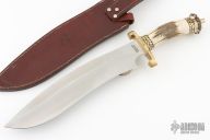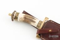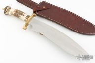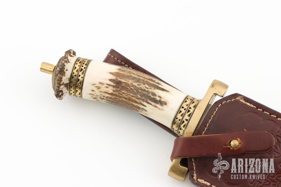 This knife by Impact Custom Knives features a satin finished blade with false top edge, .231" blade stock and 2.328" blade depth, hidden tang construction. The handle has a brass guard, stag grip and crown stag butt, brass/black/fileworked brass spacers. Comes with a tooled brown leather sheath. Has some light scratches and patina, otherwise excellent condition.