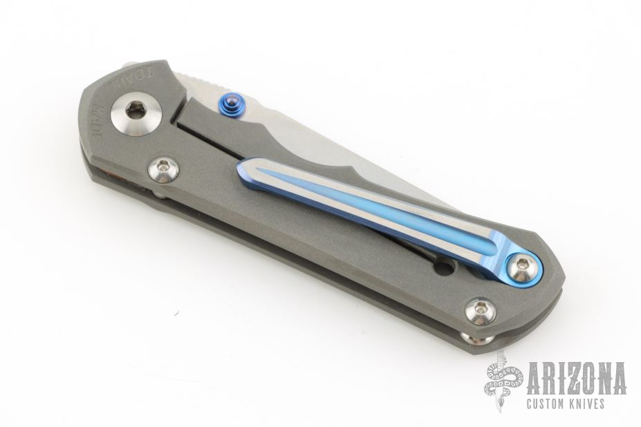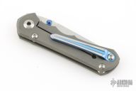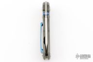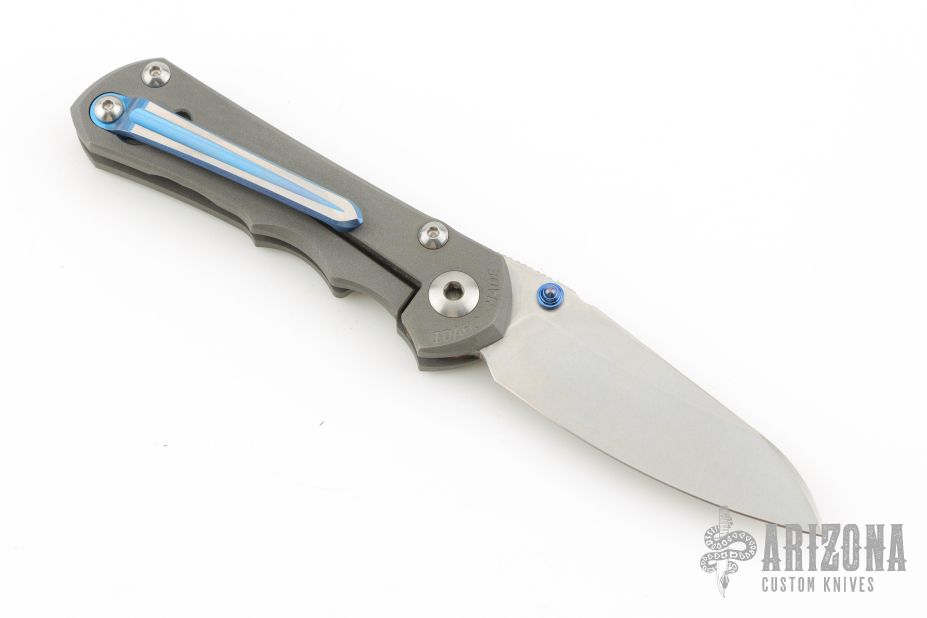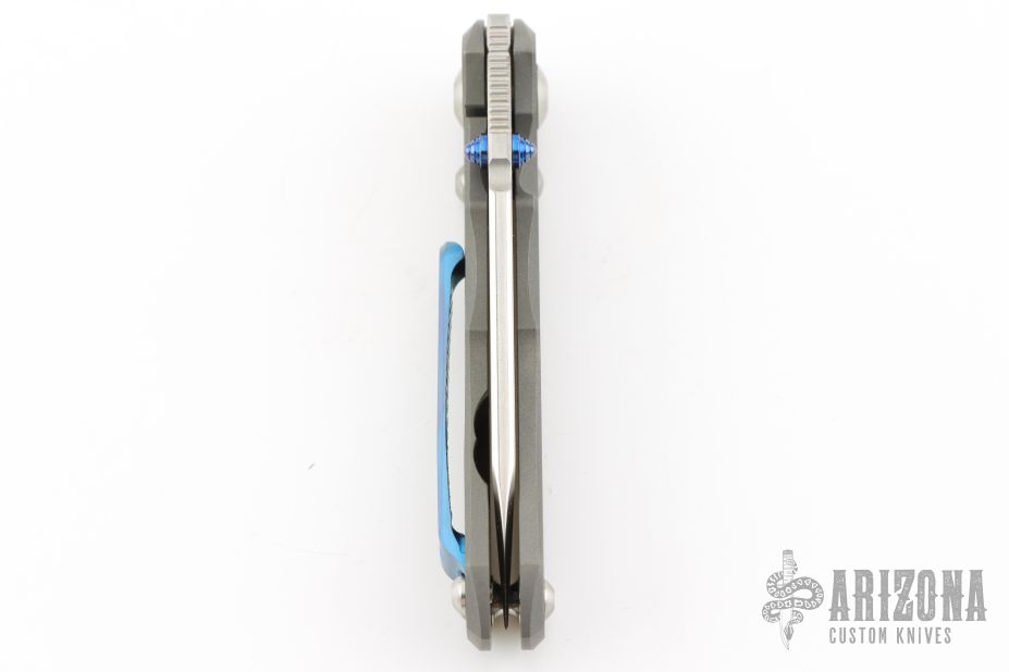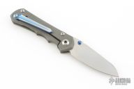 This Small Inkosi from Chris Reeve Knives features a tumble finished blade with dual anodized thumb studs and notched thumbrest. The handle is comprised of a bead blasted titanium frame over a single barrel spacer with a Millit titanium tip up clip. Includes original box, cloth, clip, tools, lube and COA dated May 16, 2018. Has a couple light scuffs, excellent condition otherwise.