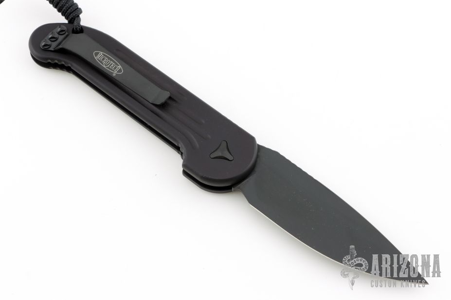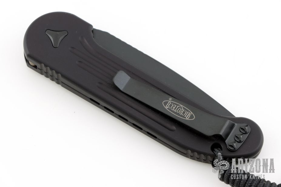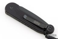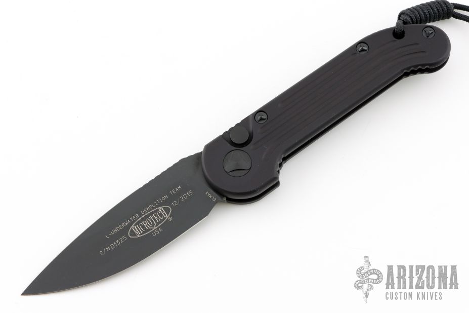 This LUDT side opening automatic by Microtech has a black blade with a standard edge and a black aluminum frame. This tactical version has black fittings. Stainless steel clip. Dated 12/2015 s/n 01325. Comes with original box and papers. Excellent condition.