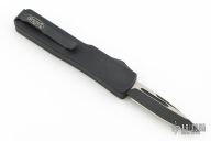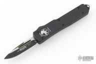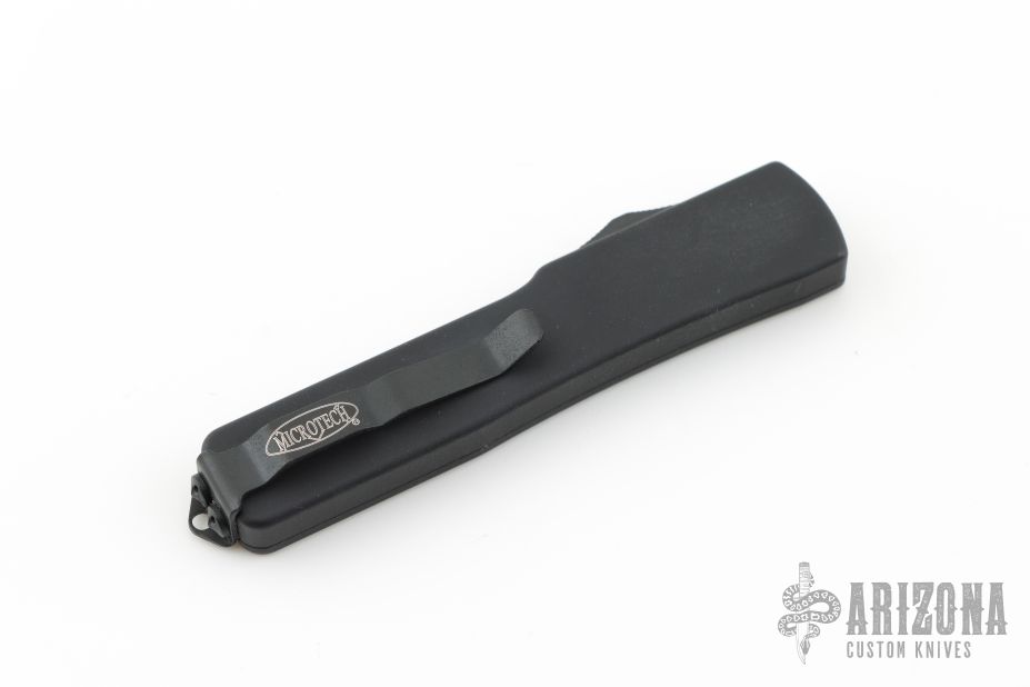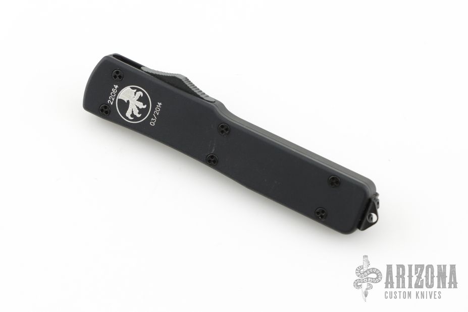 This California Legal UTX-70 features a 1.875" black finished single edged blade with fullers. The handle is comprised of black anodized aluminum handle with black stainless steel hardware, thumb slide and tip down pocket clip. Dated 03/2014 with a S/N of 22064. Includes original box, MT drawstring pouch and paperwork. Excellent Condition.